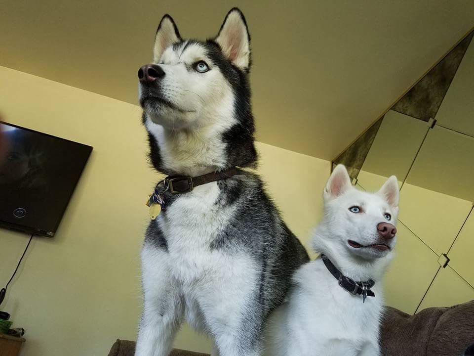 Painting of two huskies, one black and white, the other white.