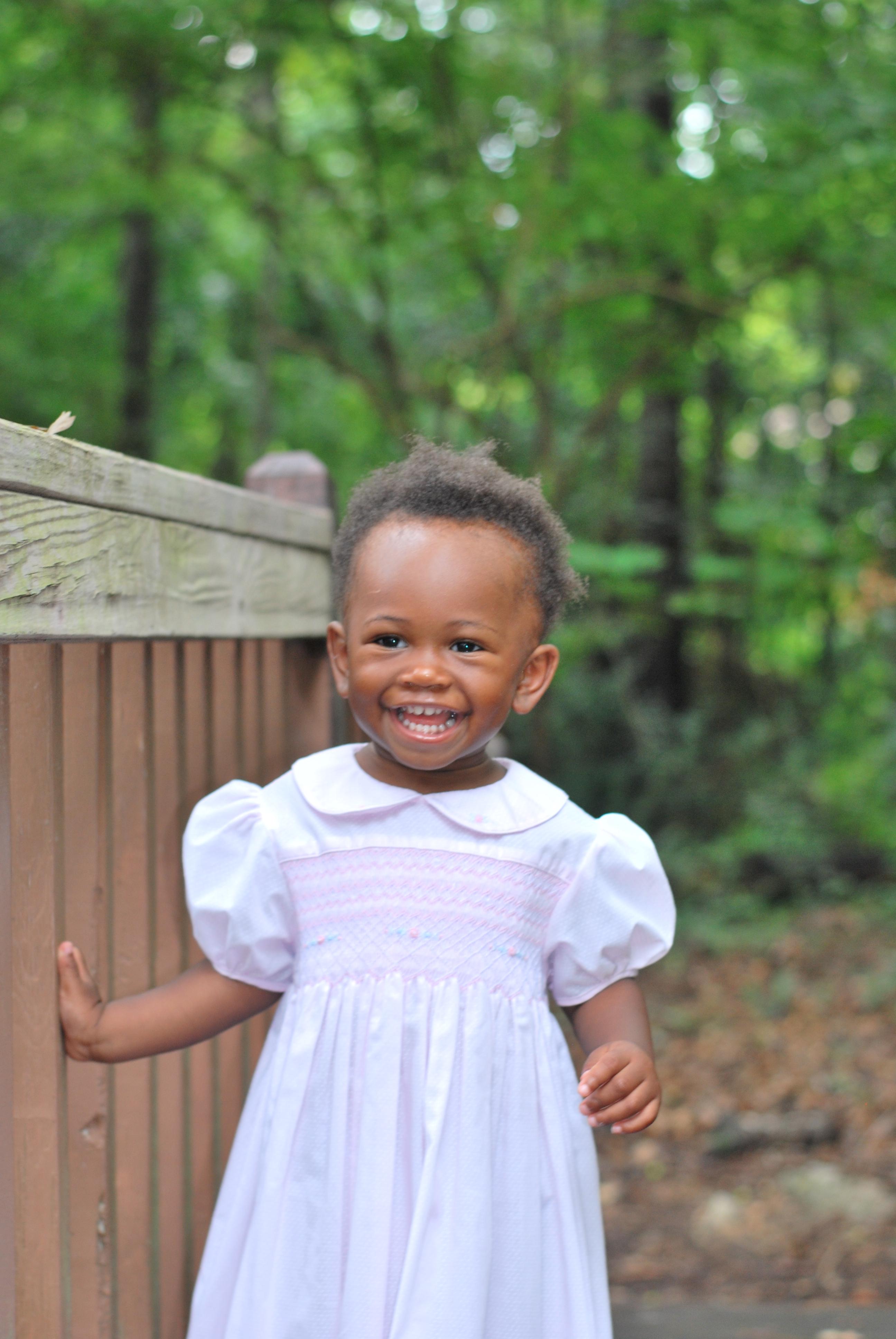 Smiling toddler girl in a light purple dress standing next to a wooden structure.