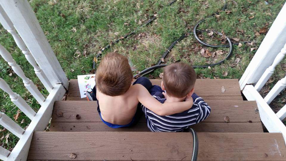 Two young boys sitting on steps, hugging, facing away from the camera.
