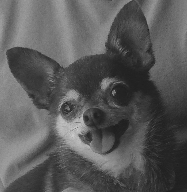 Charcoal drawing of a happy chihuahua with its tongue out.