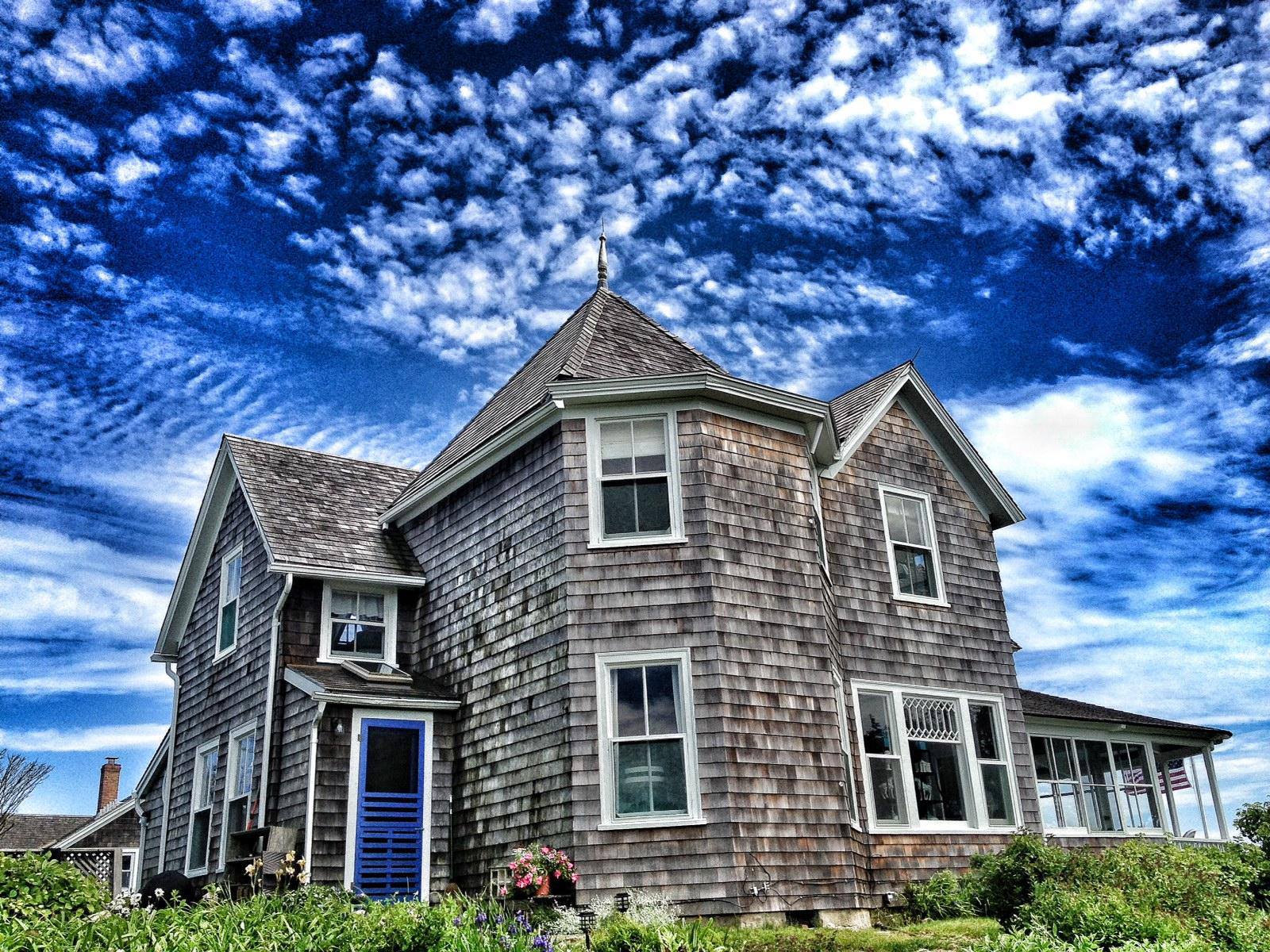 Painting of a large, gray, shingled house under a dramatic blue sky with puffy clouds.