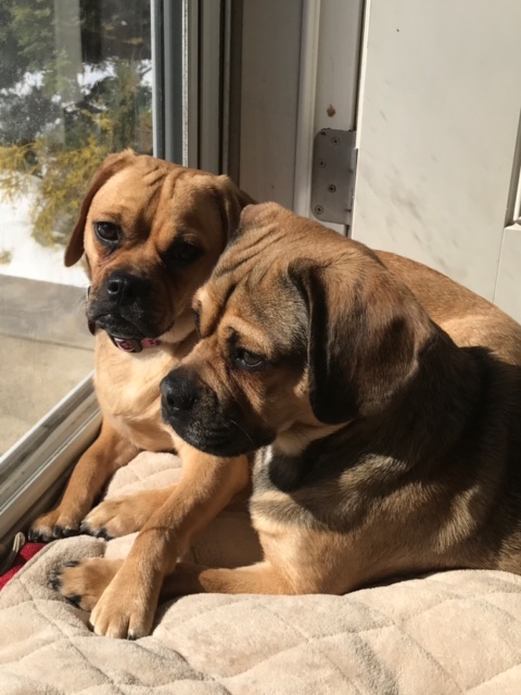 Painting of two puggle dogs resting together.