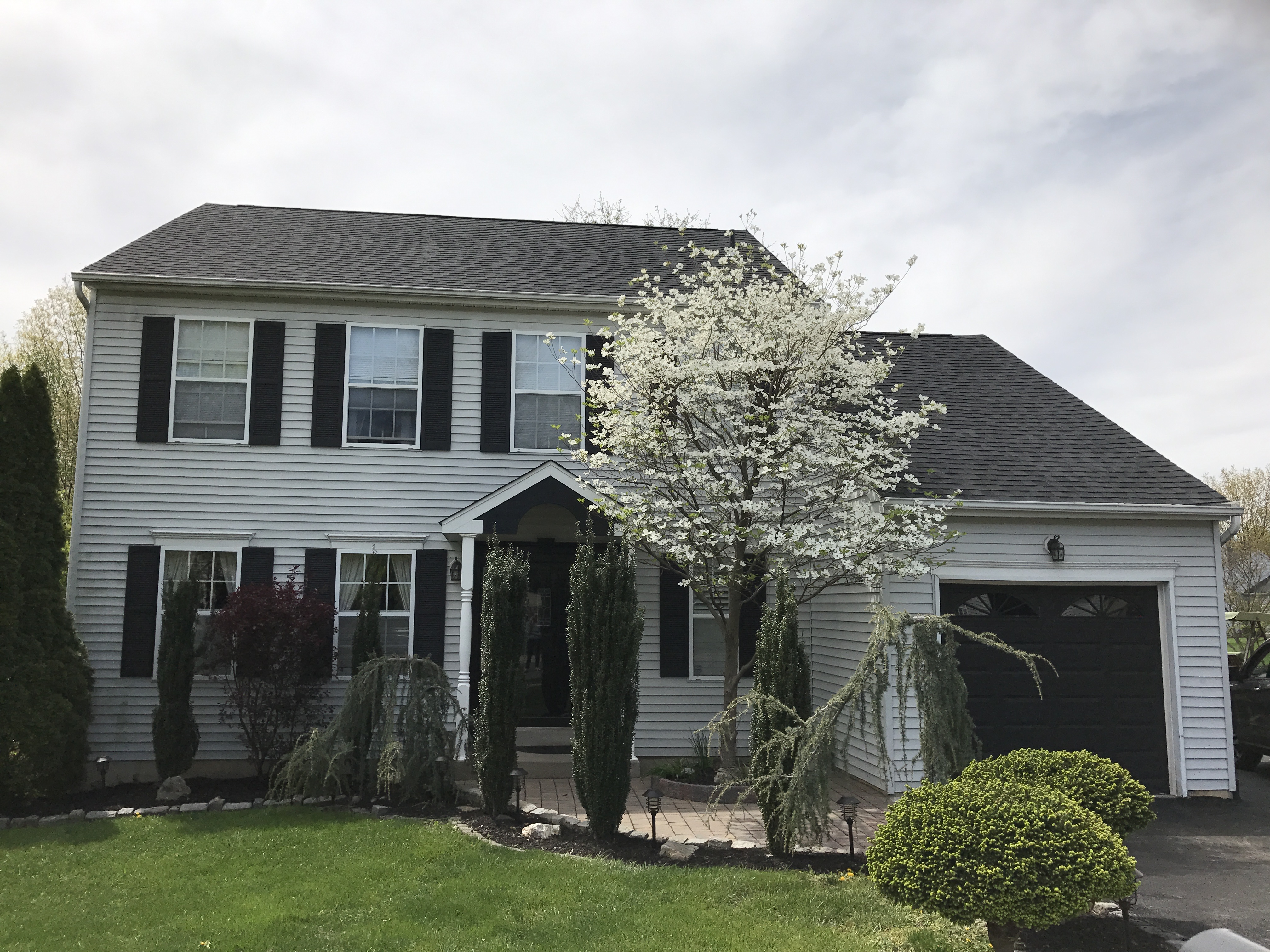 Painting of a two-story light gray house with black shutters, flowering tree, and landscaped yard.
