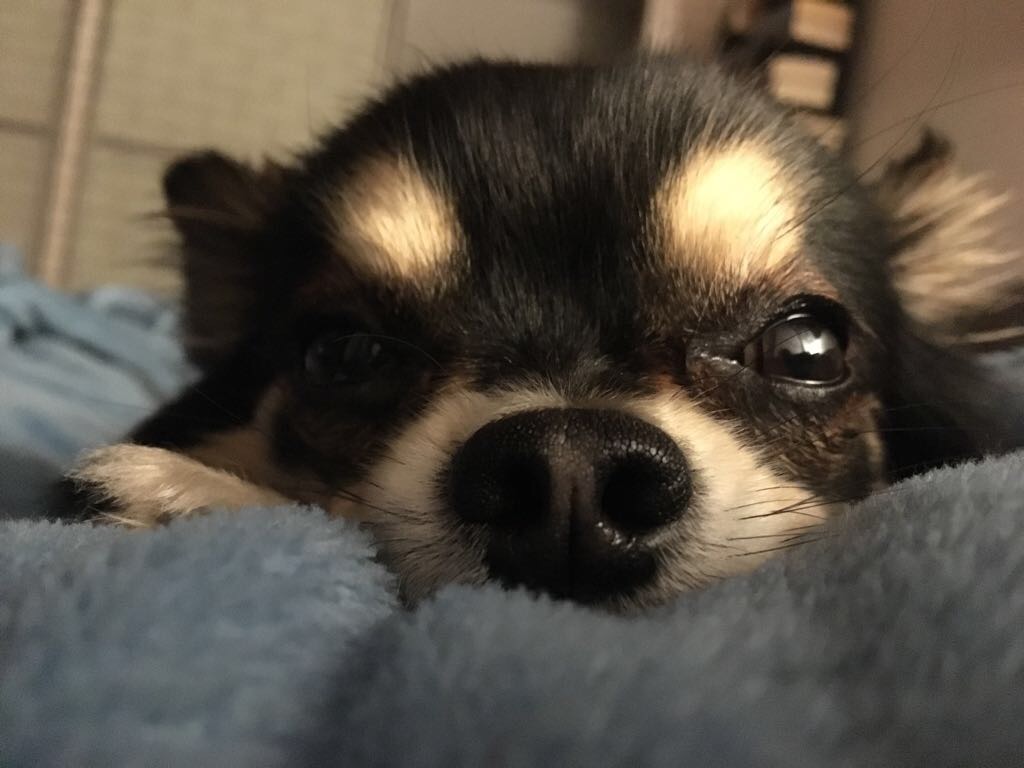 Painting of a long-haired chihuahua resting on a blue blanket.