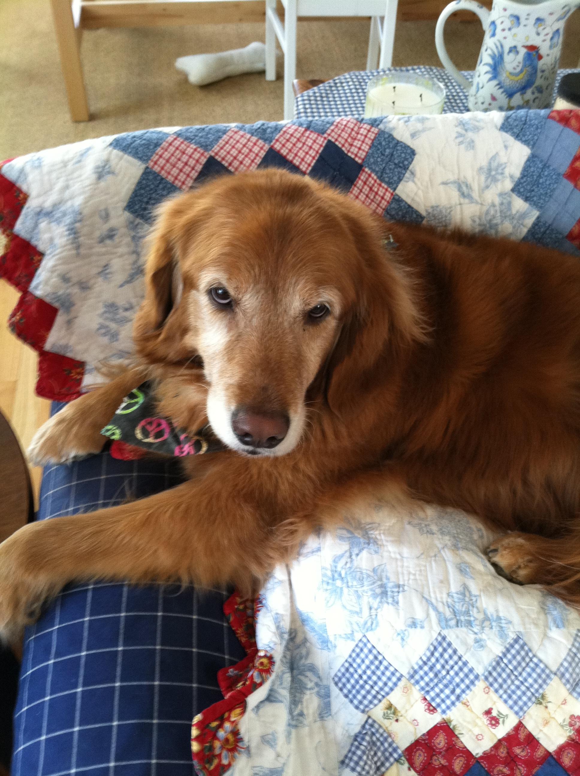 Painting of a golden retriever wearing a bandana