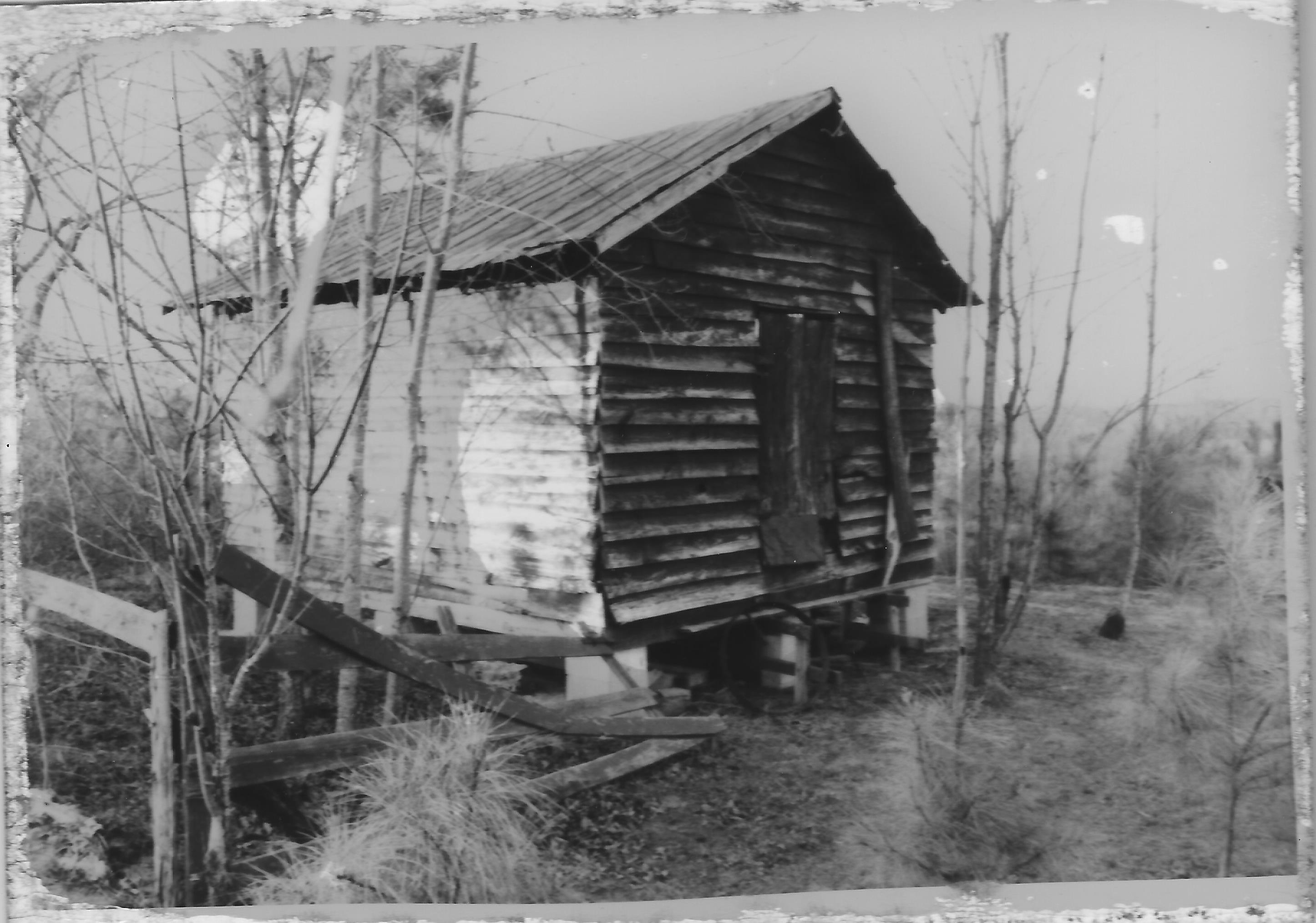 Black and white painting of a dilapidated shed on wheels amongst bare trees and a broken fence.
