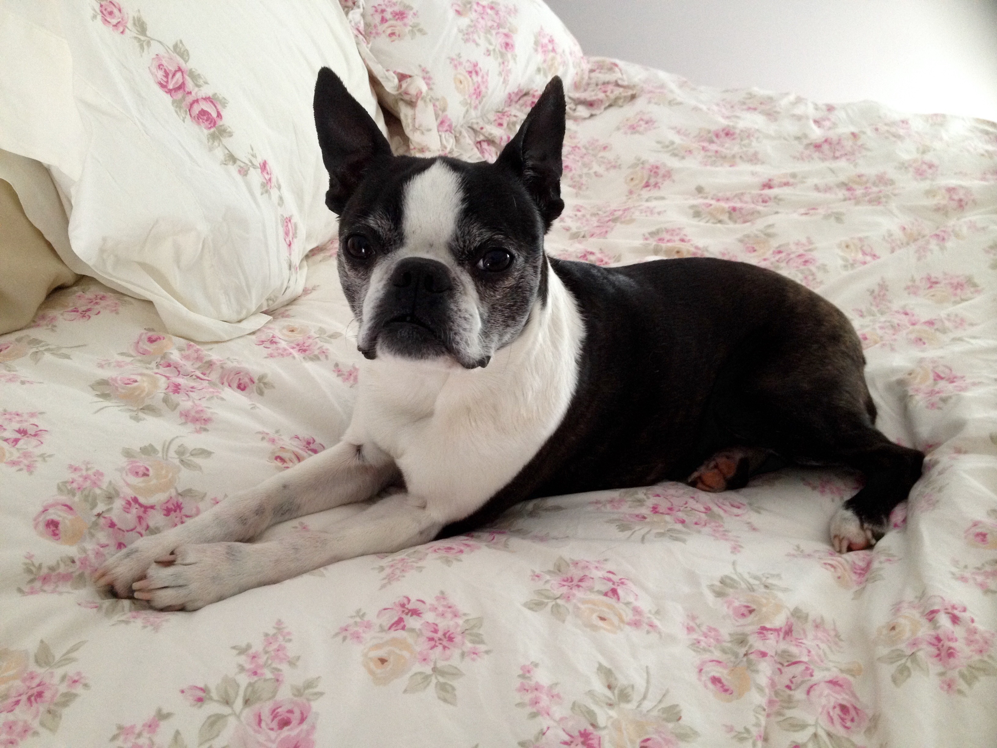 Painting of a Boston Terrier lying on a floral bedspread.