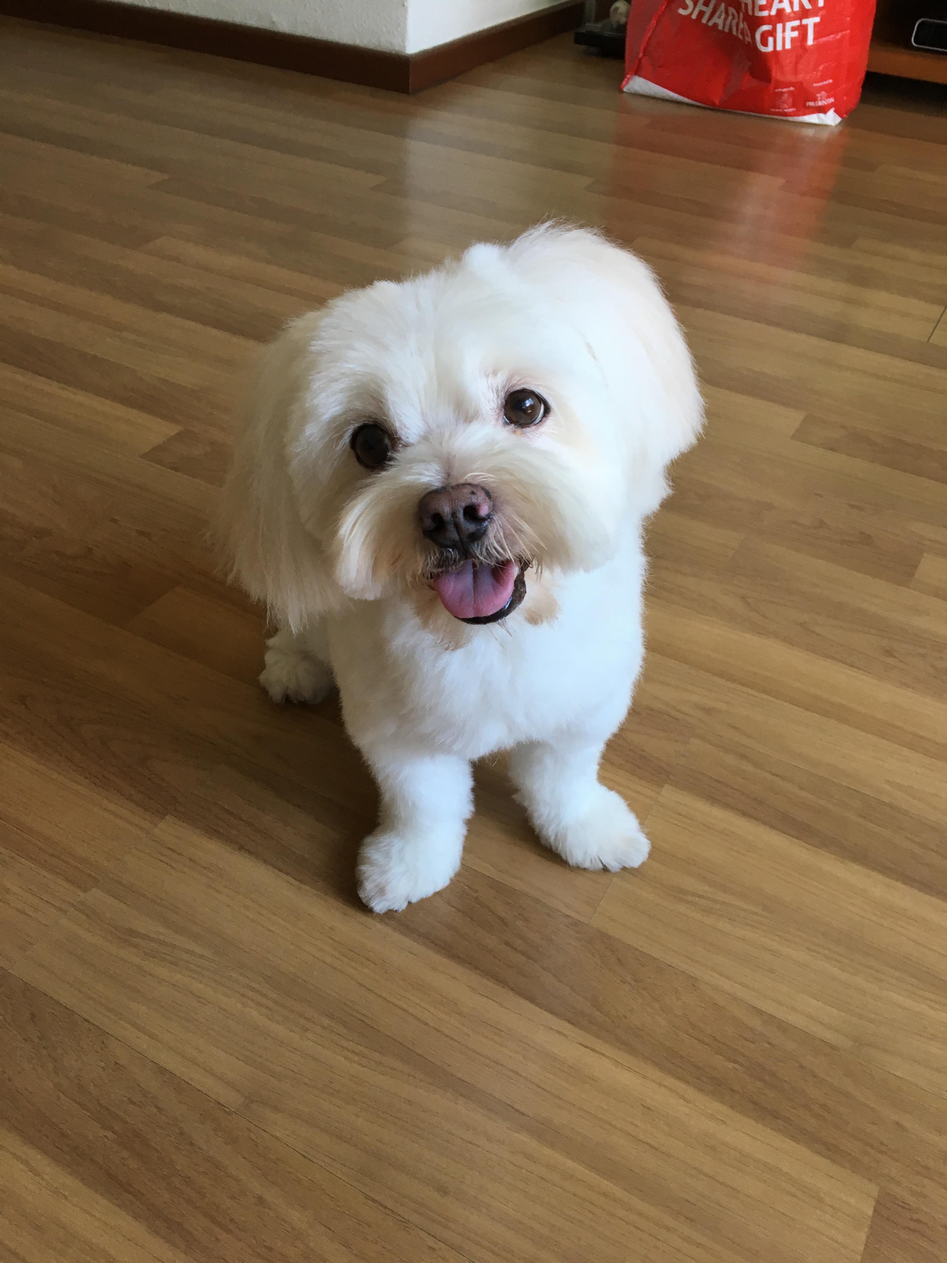 Painting of a fluffy white Maltese dog sitting on a wood floor.
