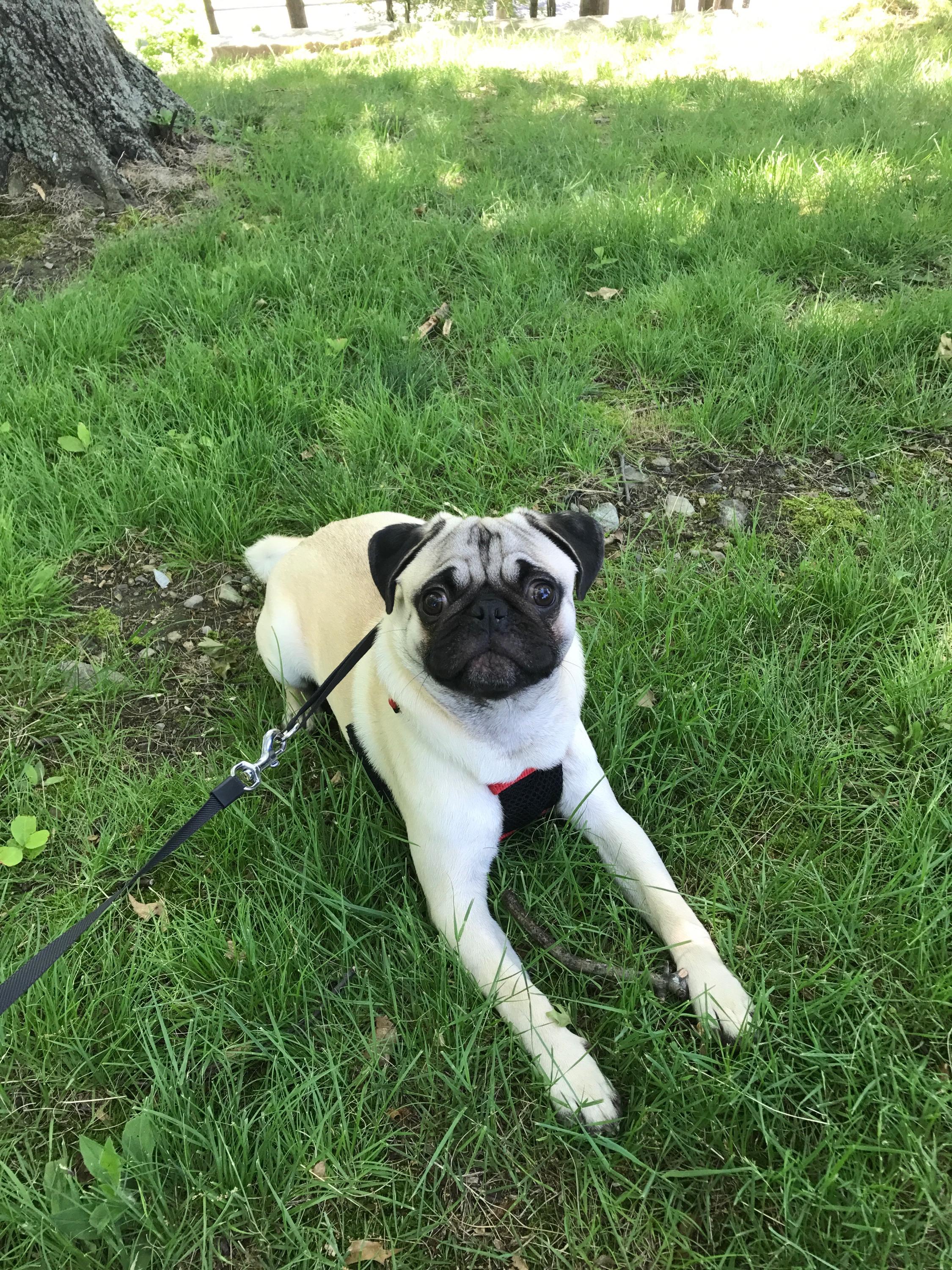 Painting of a fawn pug lying in the grass