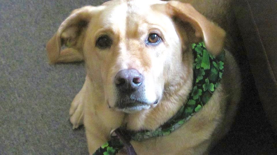 Painting of a yellow Labrador wearing a green bandana.
