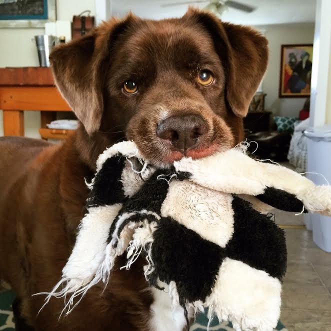 Chocolate Labrador holding toy in mouth.