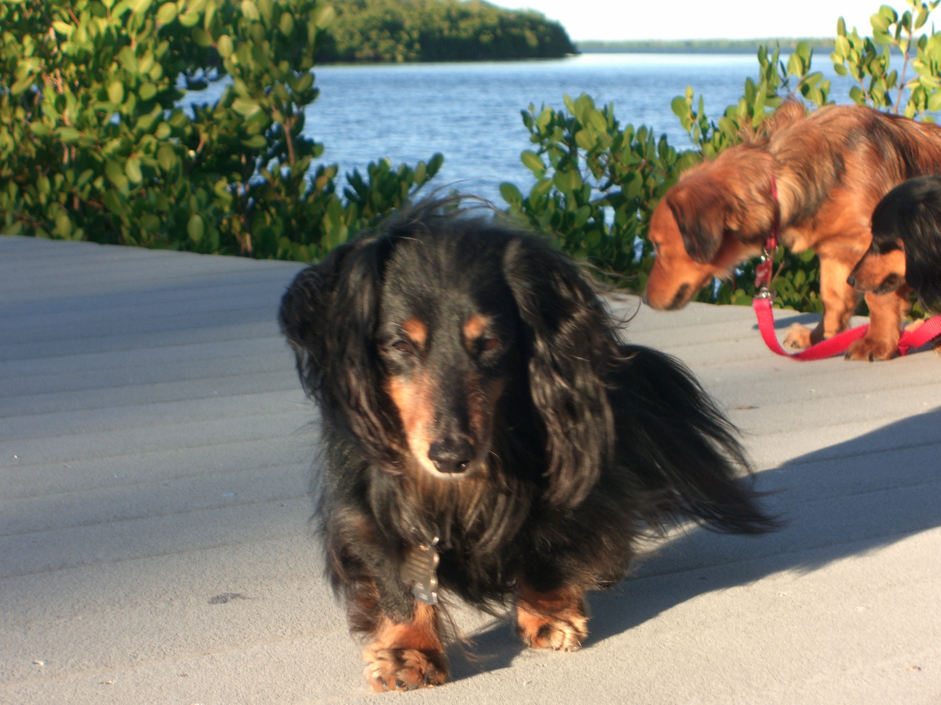Painting of a longhaired dachshund with its tongue out.