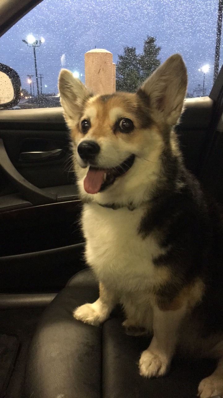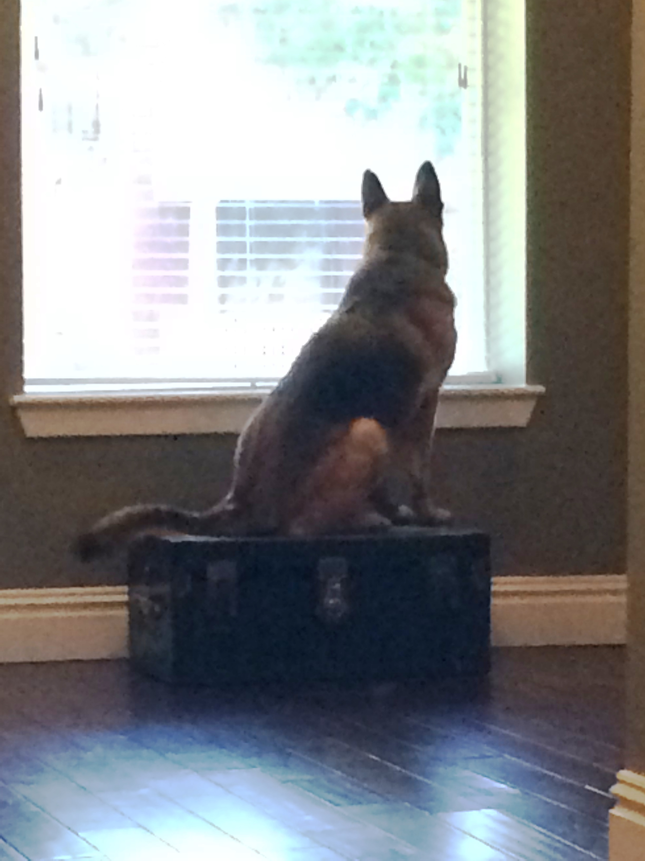 Dog sitting on a trunk, looking out a window at a snowy street.