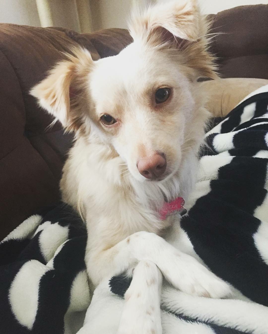 Framed painting of a small dog in a red jersey next to a hot dog, the same dog lies on a couch below the painting.