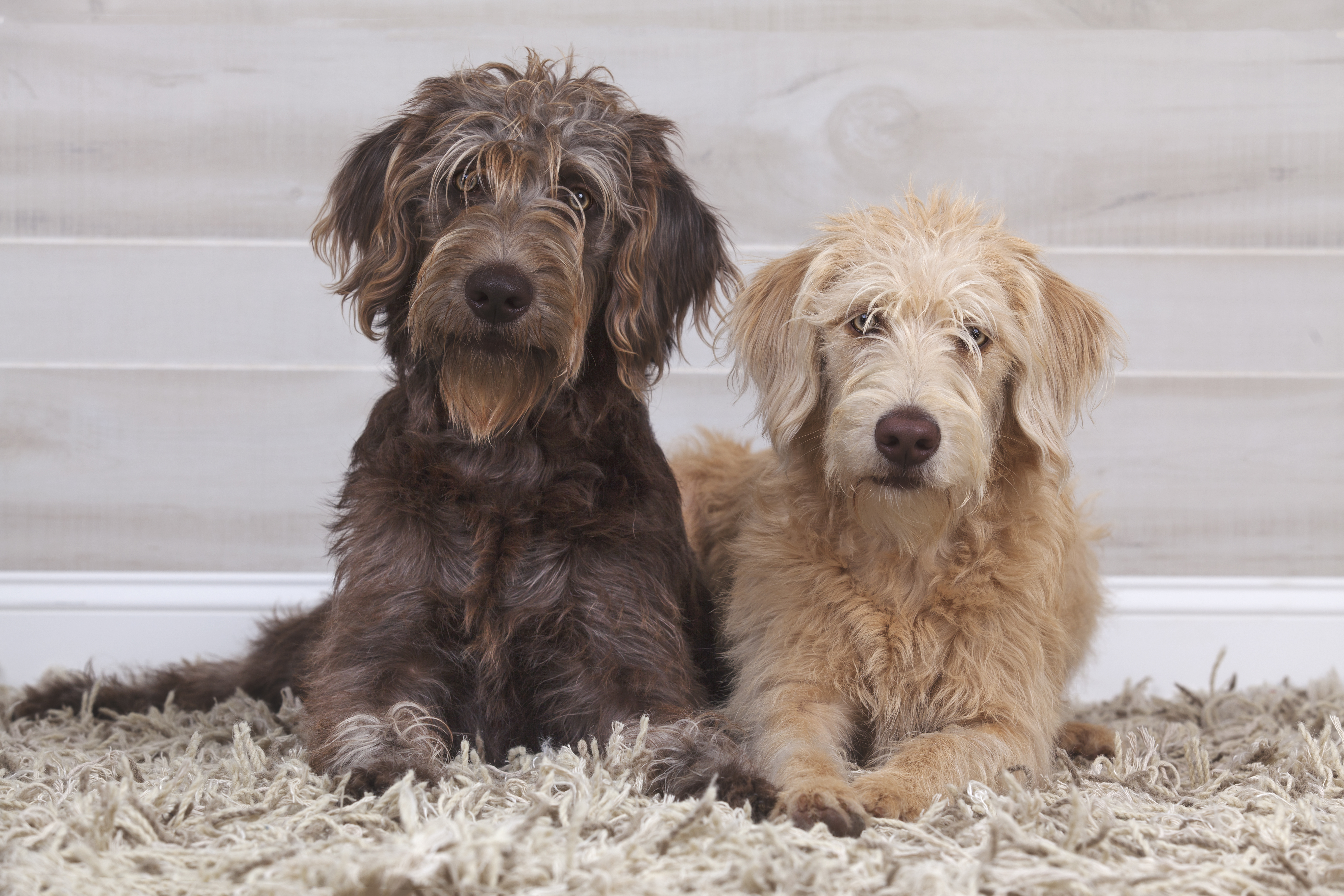Painting of two puppies sitting side-by-side outdoors.