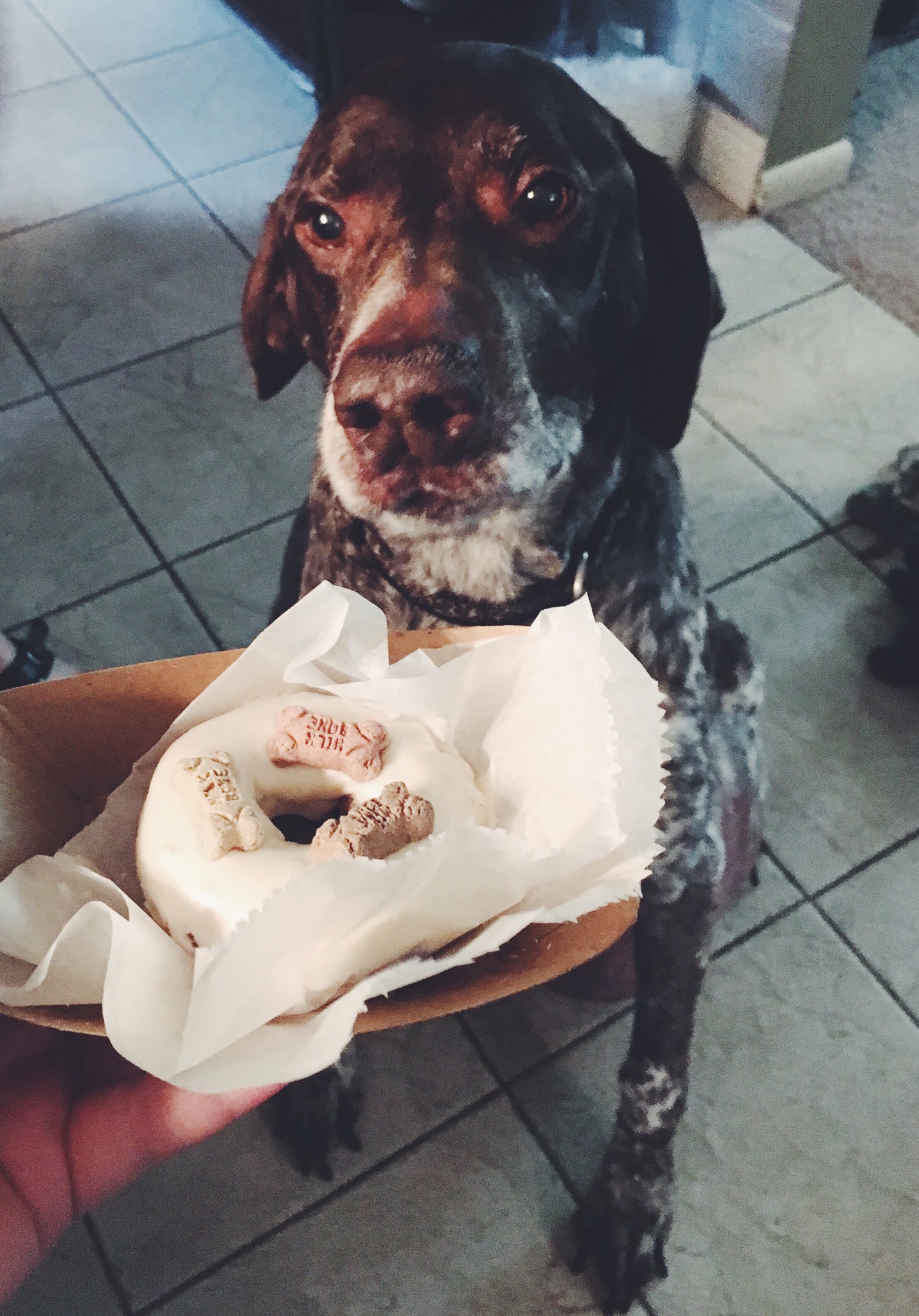 Painting of a German Shorthaired Pointer dog looking expectantly at a plate of dog biscuits.