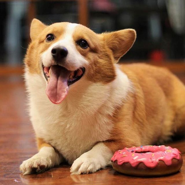 Painting of a happy corgi lying on a wood floor next to a donut.