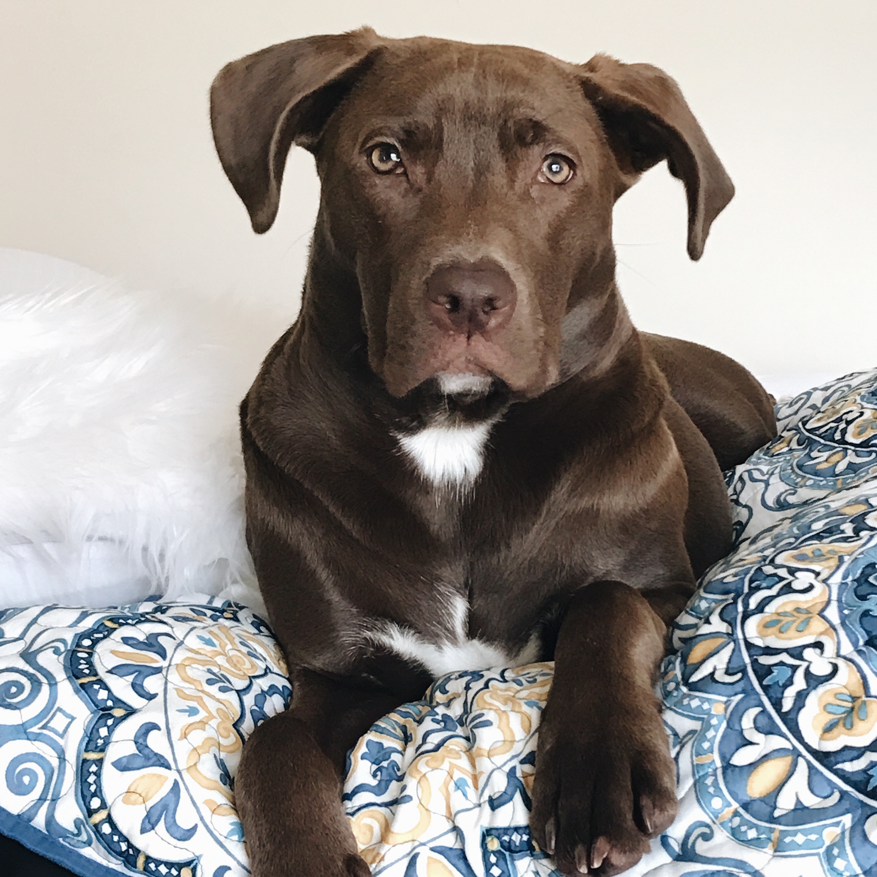 Painting of a dark brown dog resting on a patterned pillow