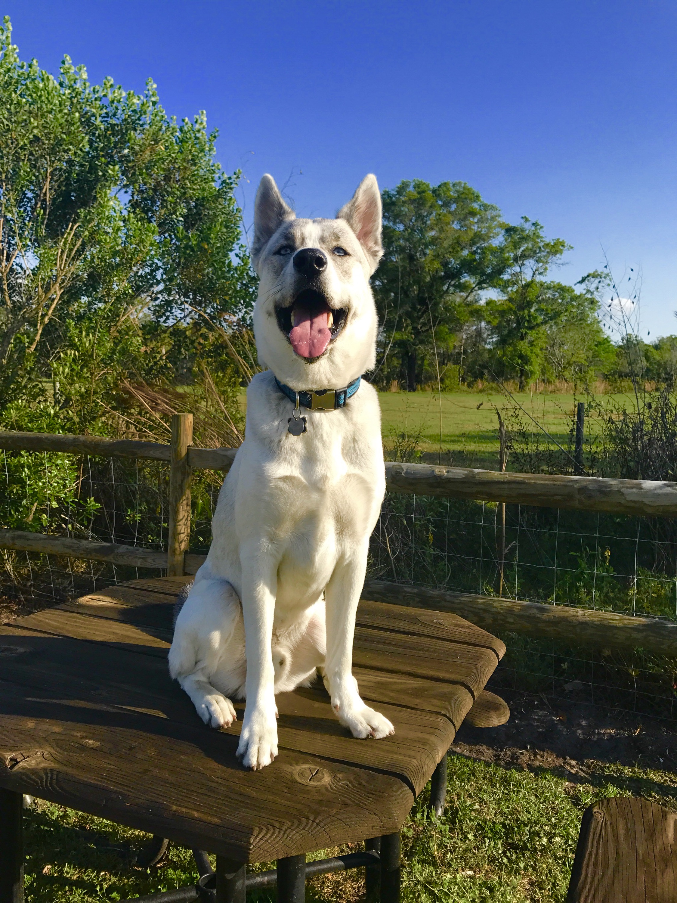 Painting of a smiling white dog sitting on a wooden bench outdoors.