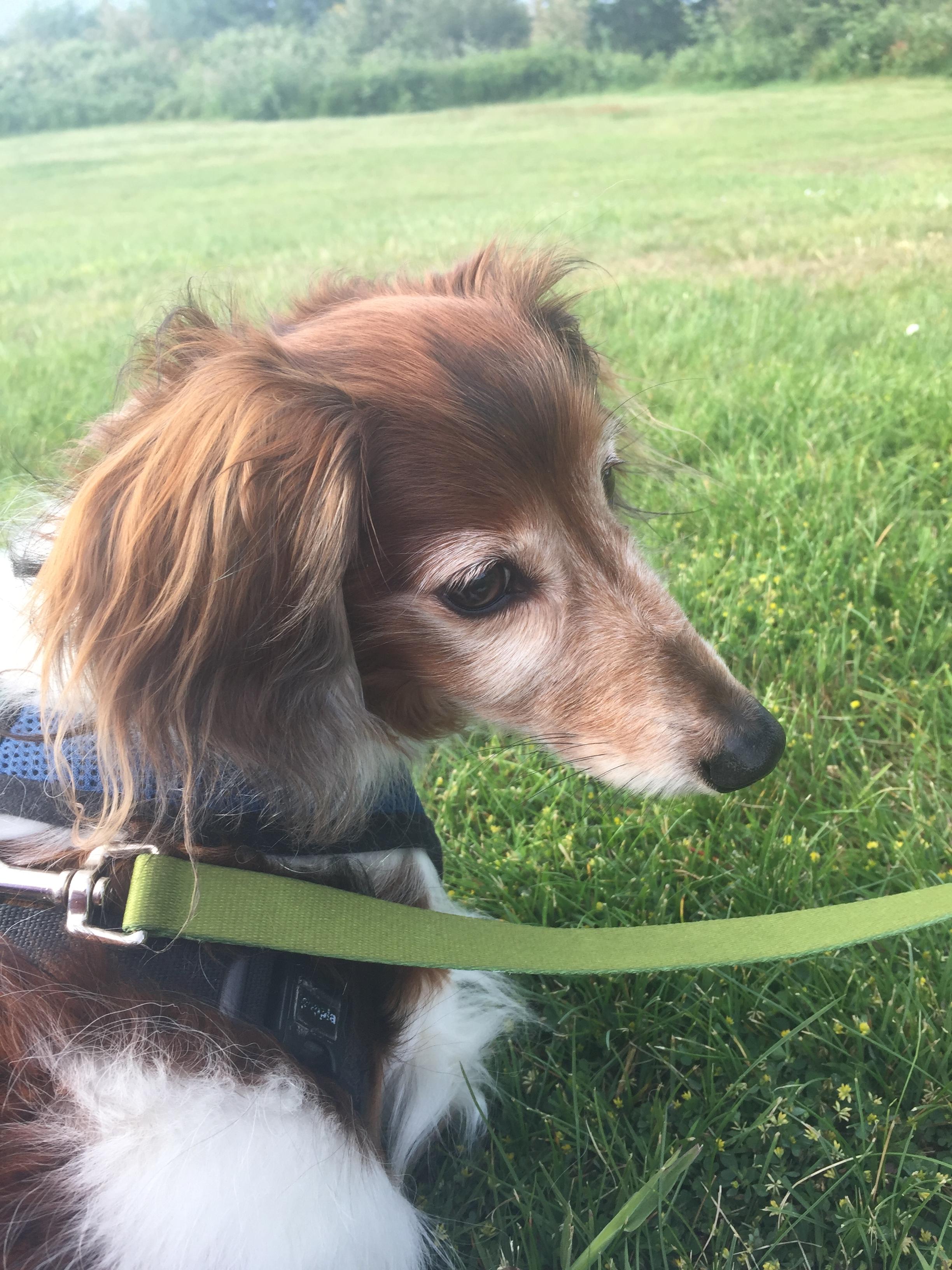 Painting of a longhaired dachshund resting its head on a teal pillow.