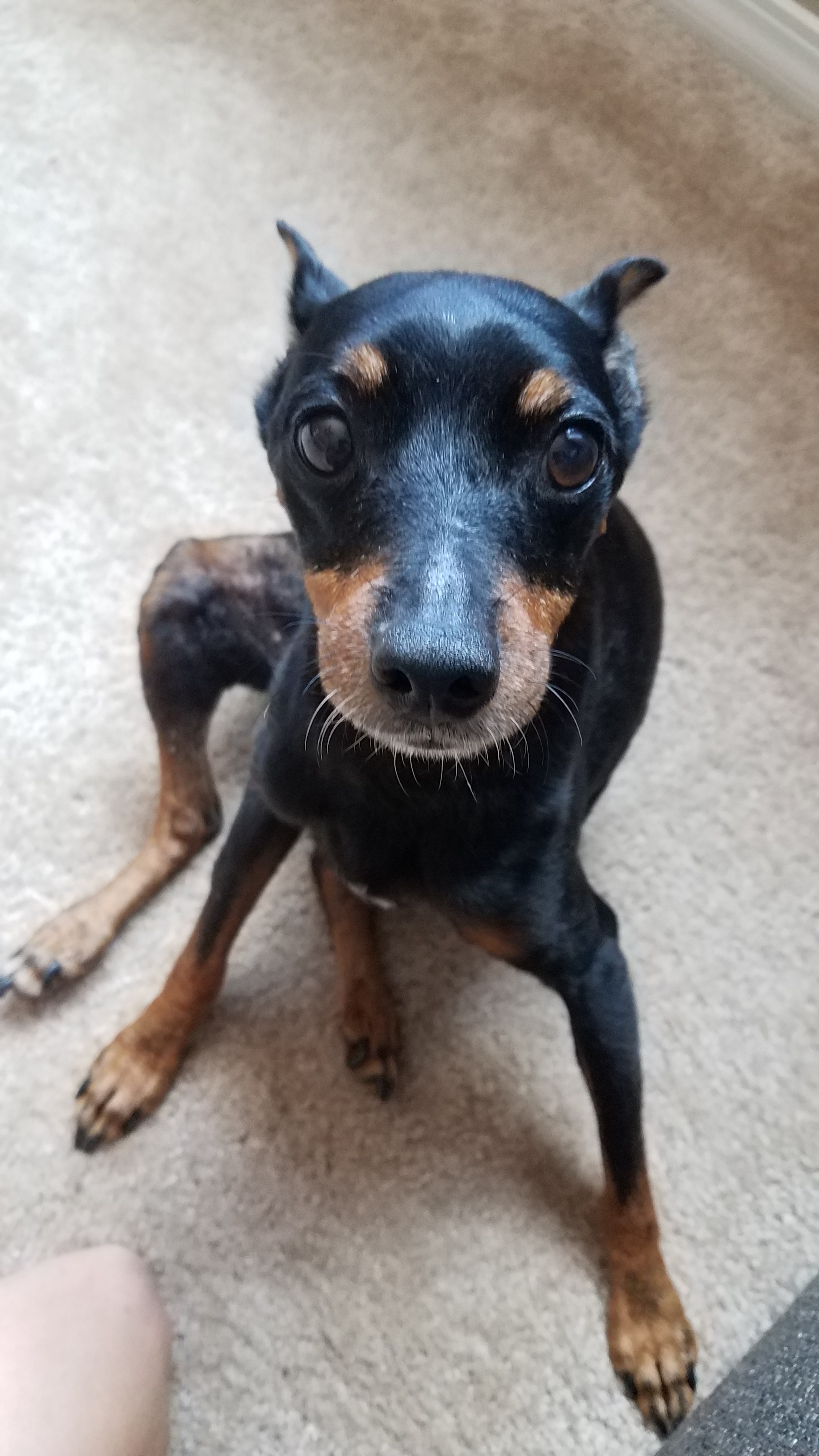 Painting of a miniature pinscher looking up at the viewer