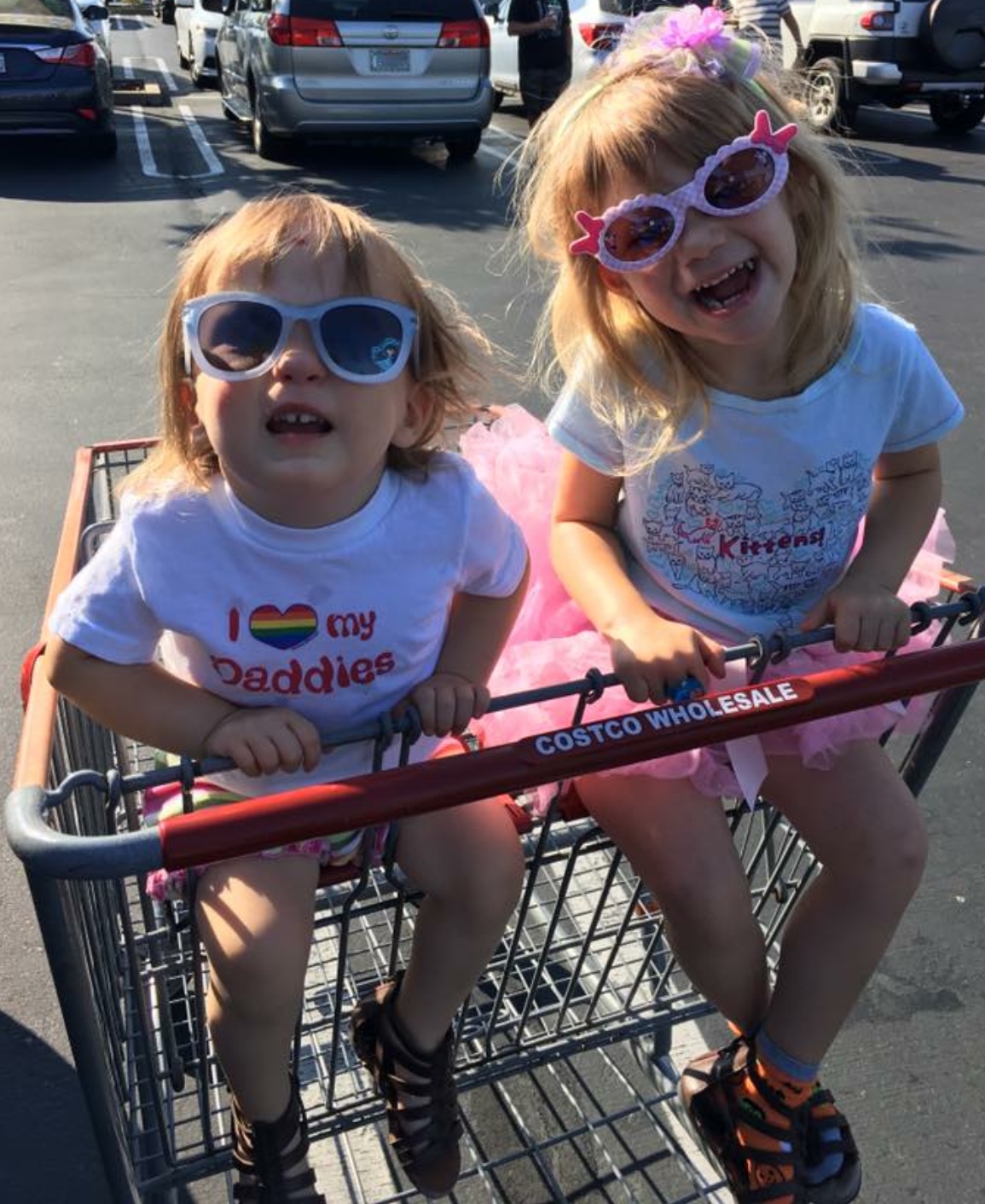 Two toddlers in sunglasses sitting in a shopping cart.