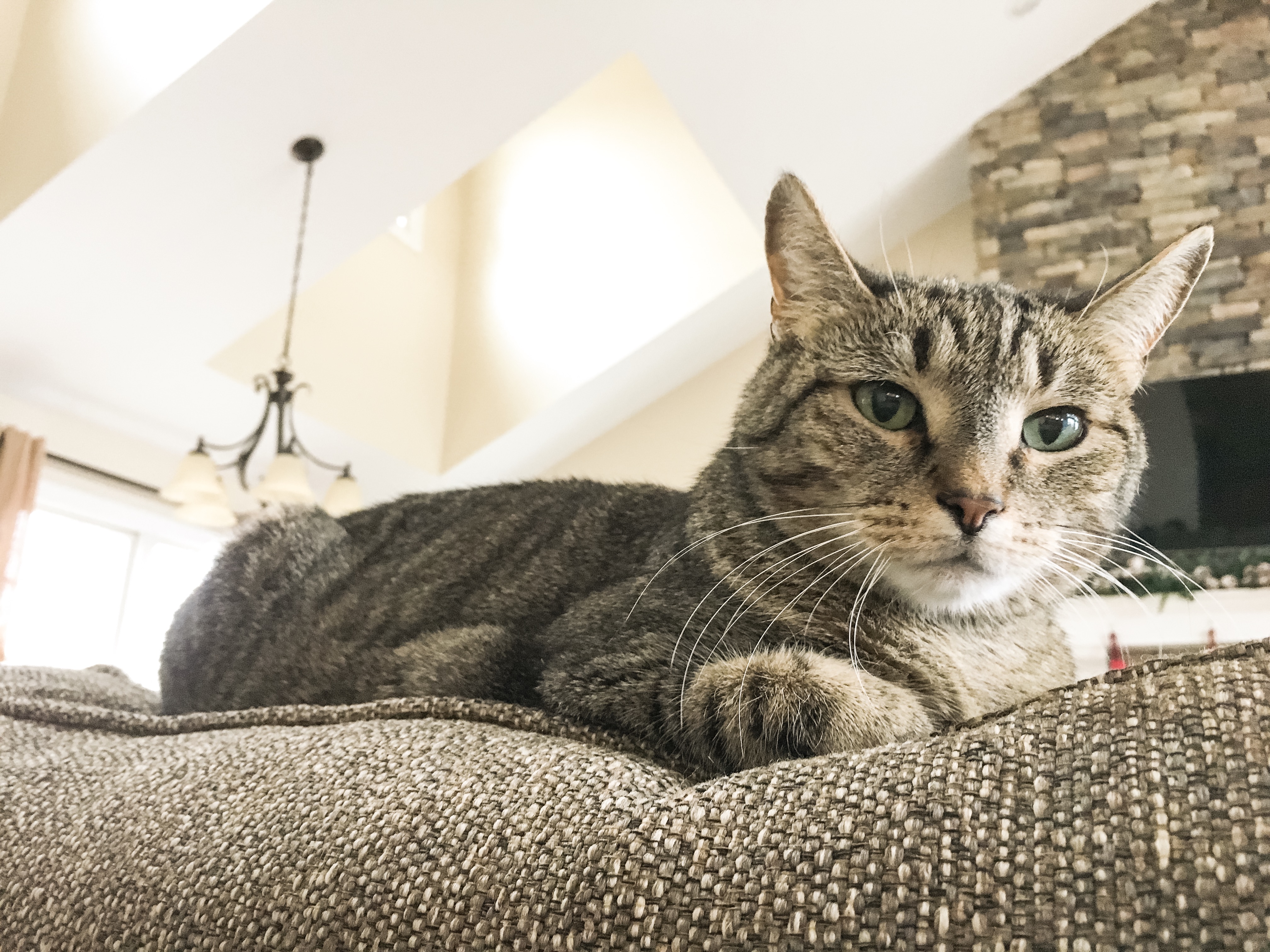 Painting of a grey tabby cat with blue eyes lying on a textured surface.