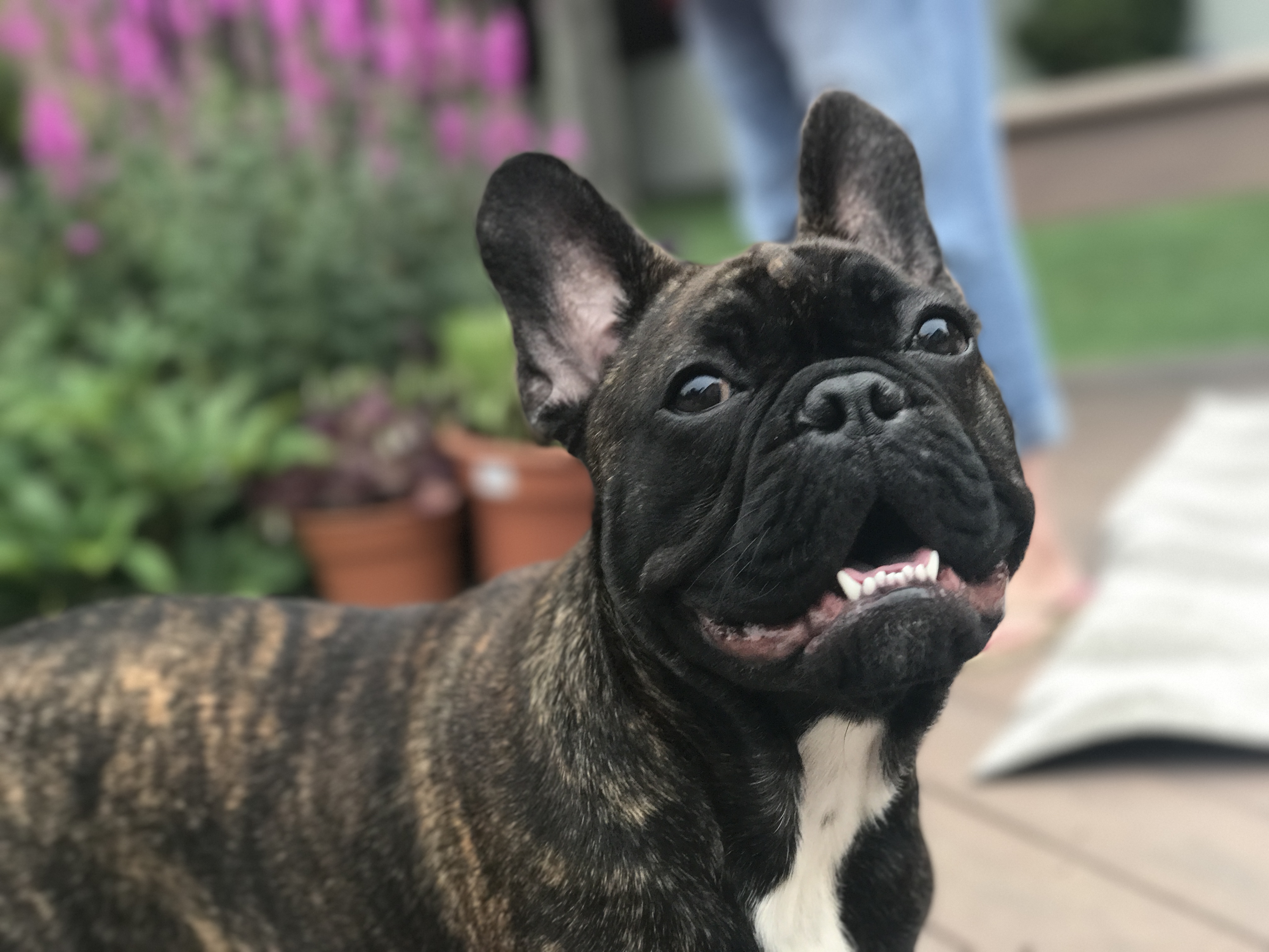 Painting of two French bulldogs on a couch, one fawn, one black and white.