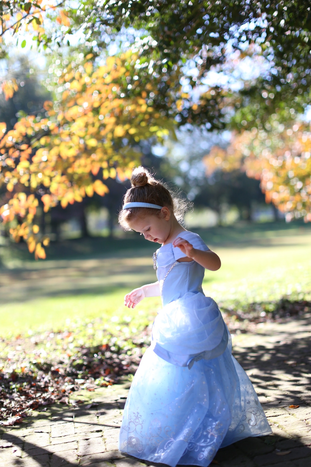 Painting of a toddler girl in a blue princess dress walking outdoors