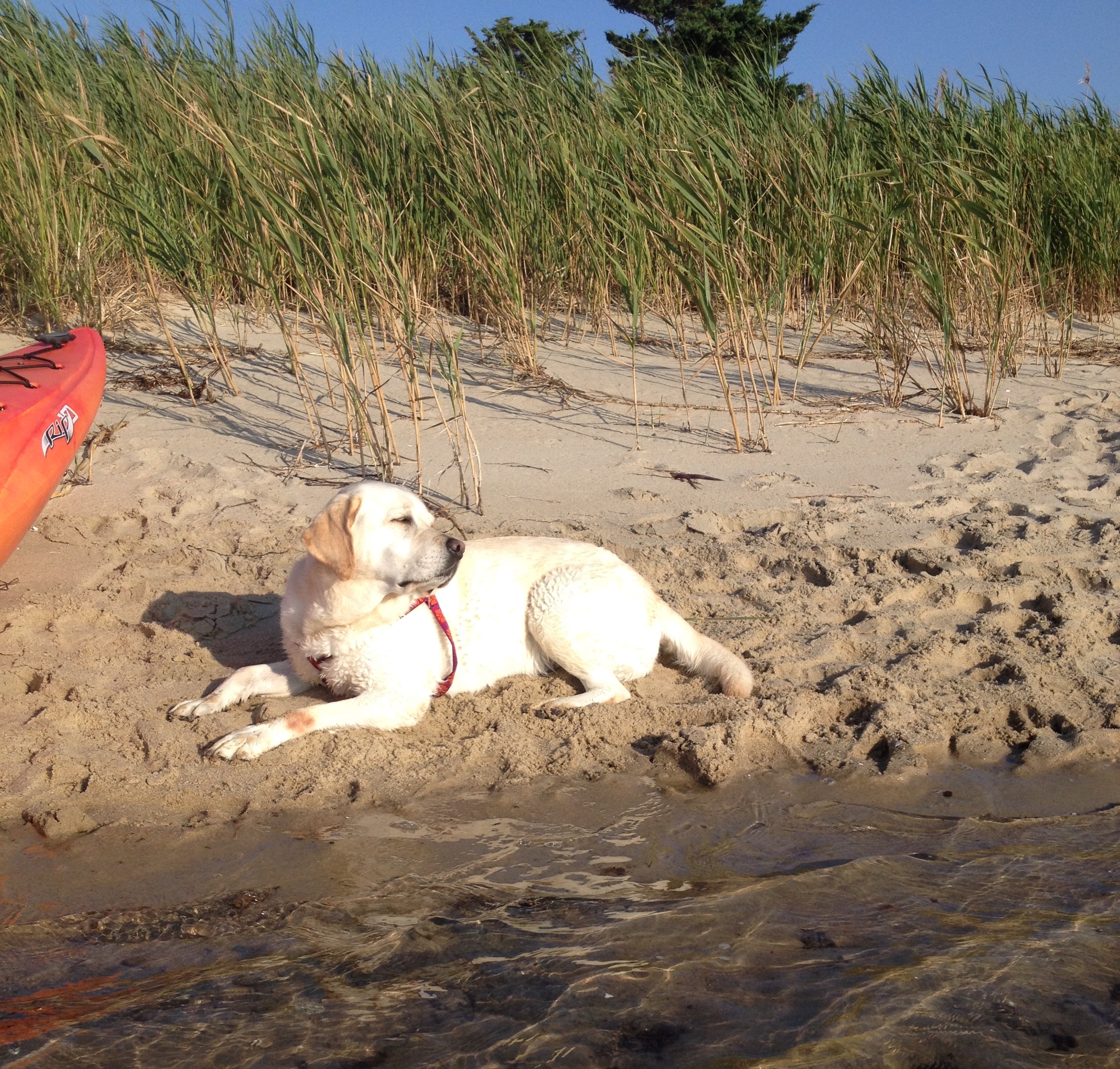White Labrador Retriever resting on sandy beach near red kayak and tall grass.