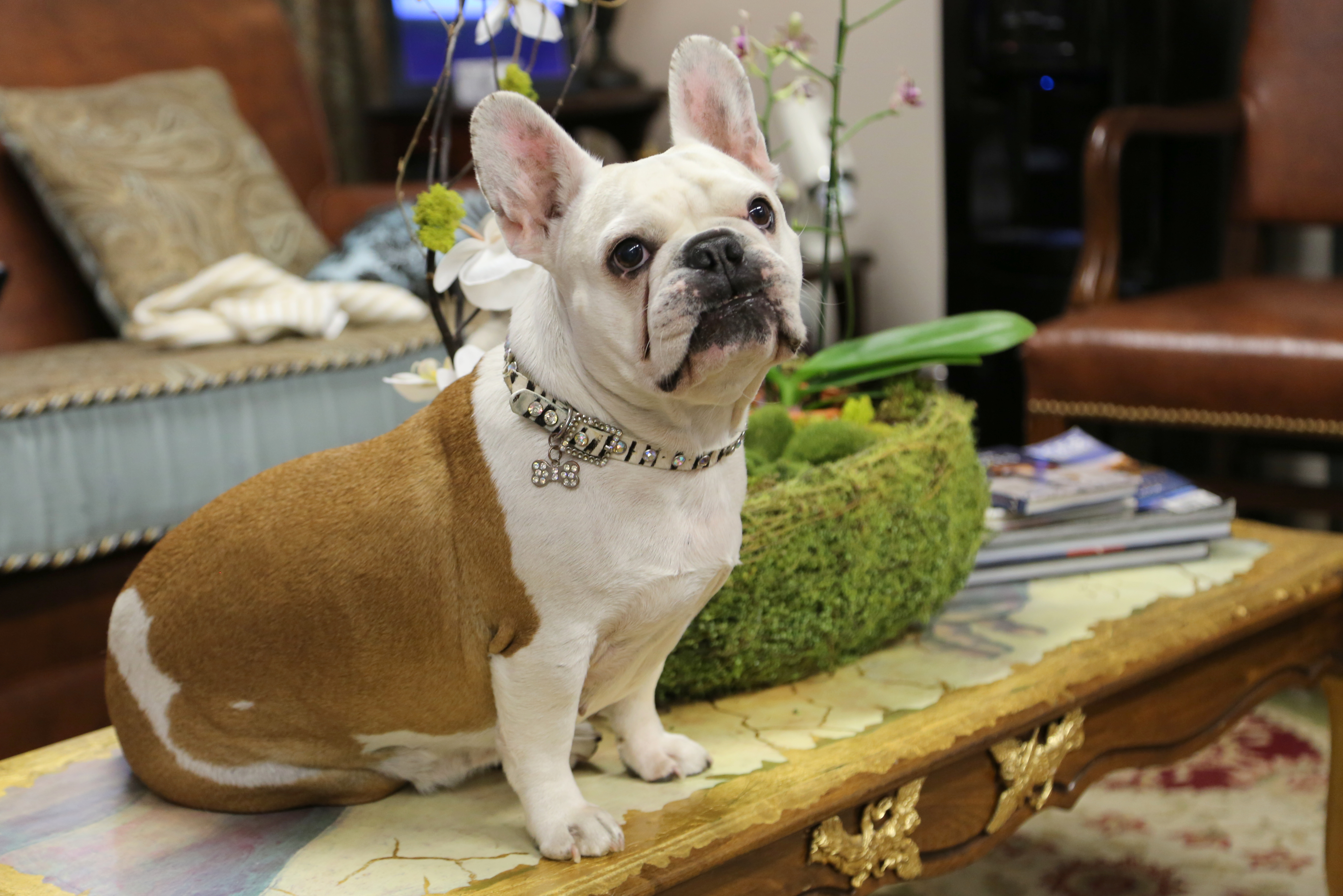 Painting of a French bulldog wearing a crown and ornate Elizabethan-style collar.