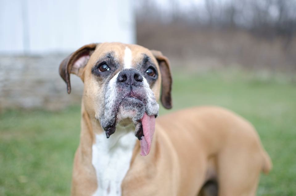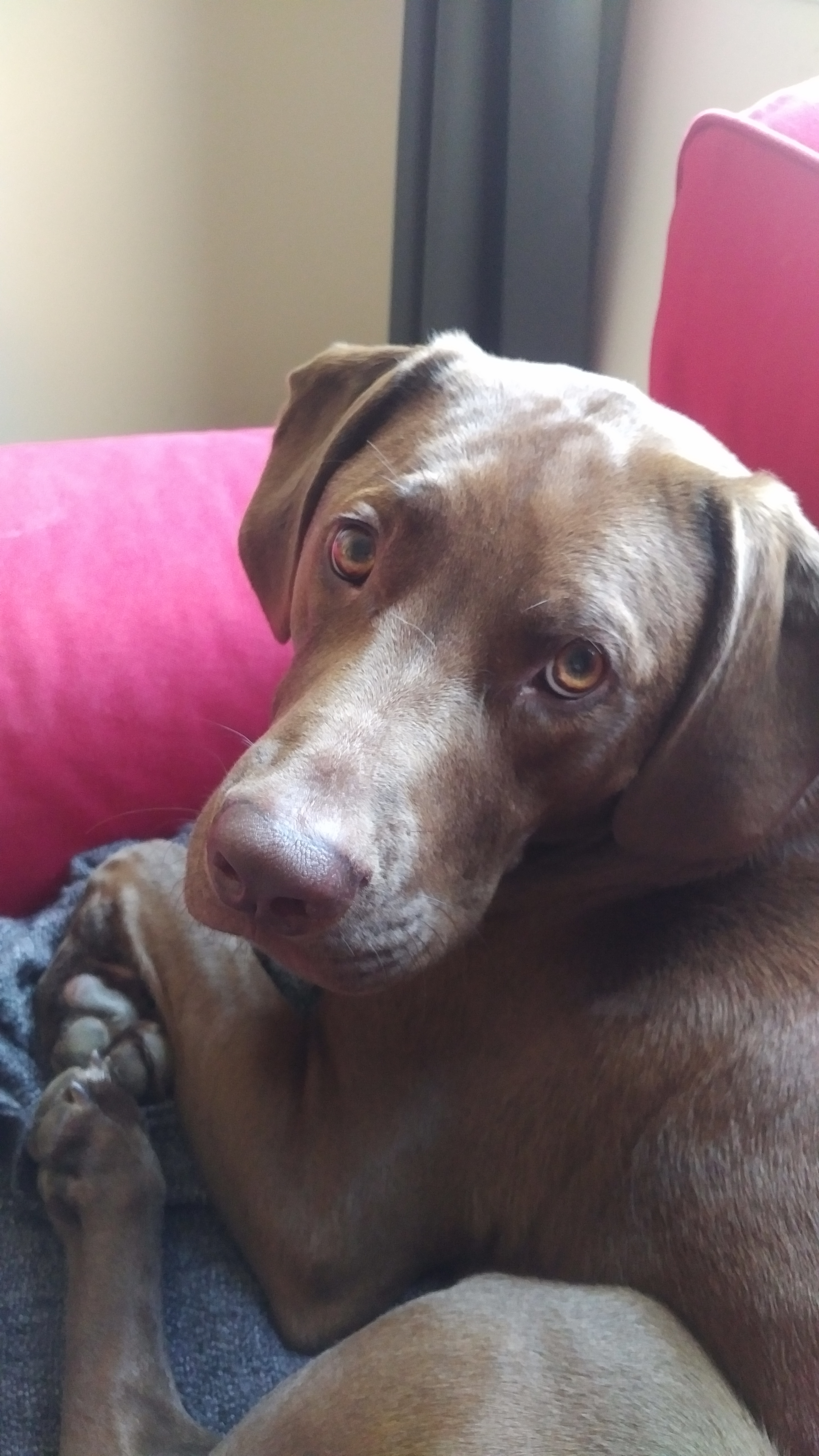 Painting of a brown dog wearing a collar with a tag that reads Tory