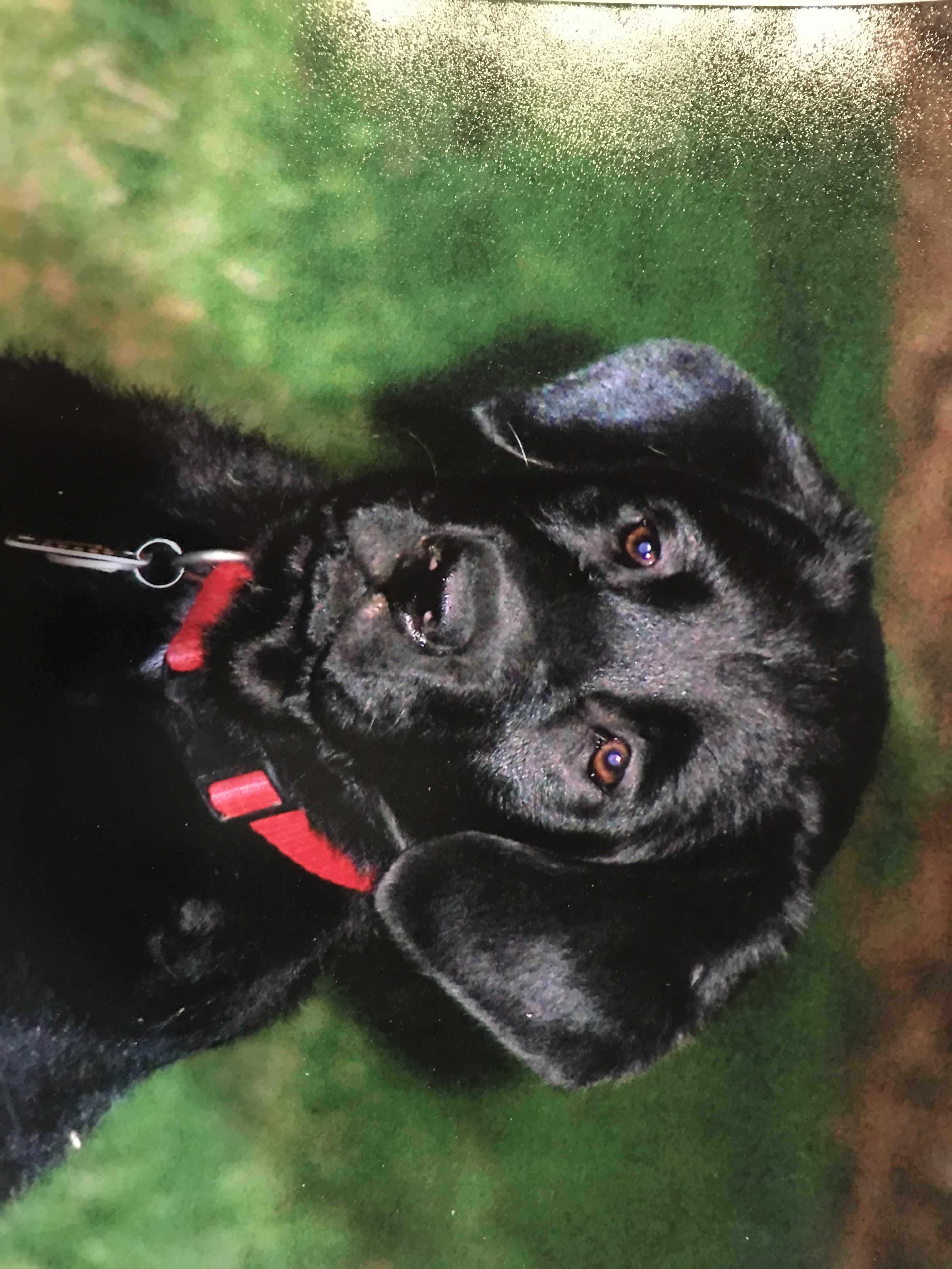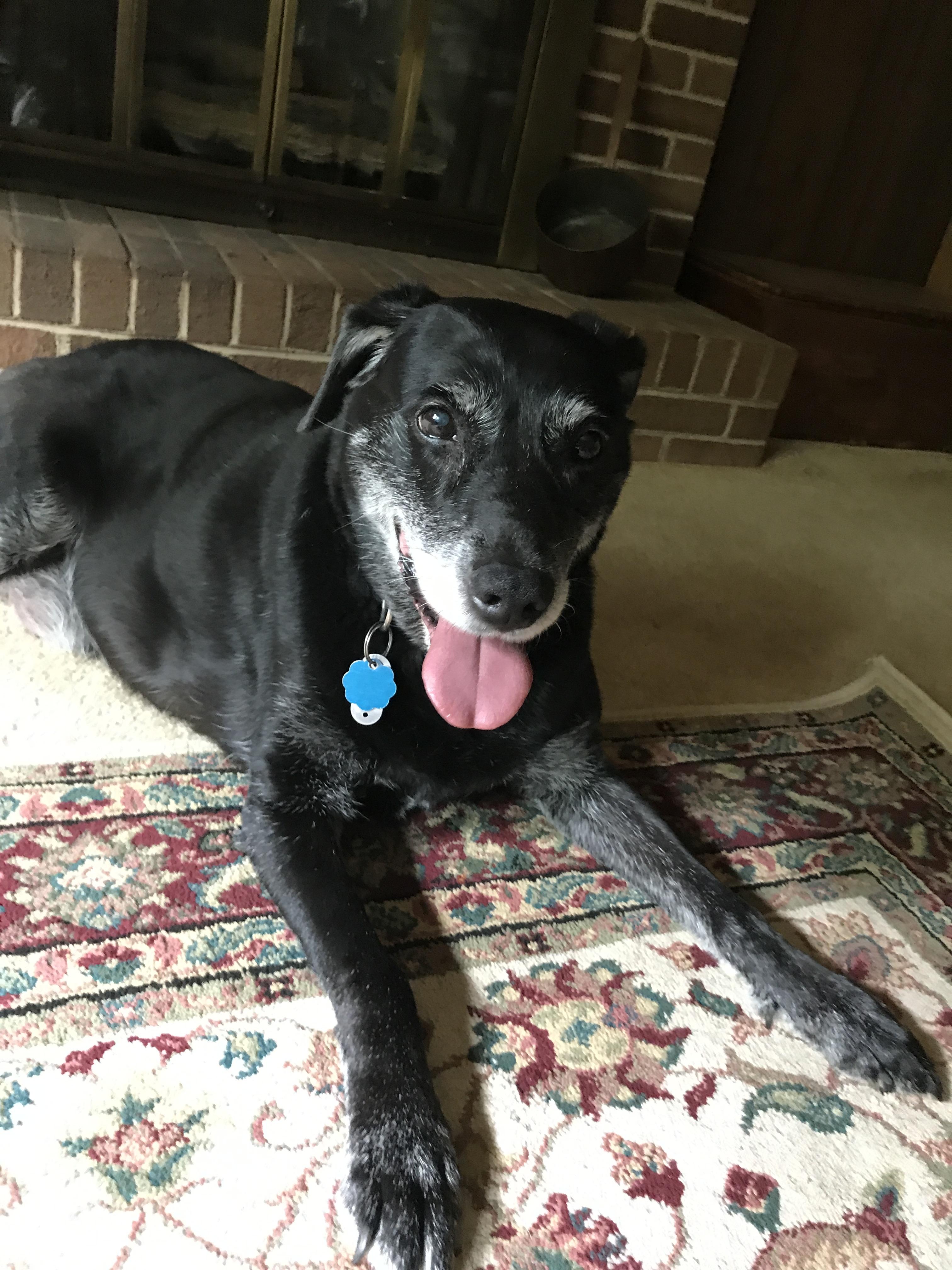 Painting of a senior black dog lying on an ornate rug, tongue out.
