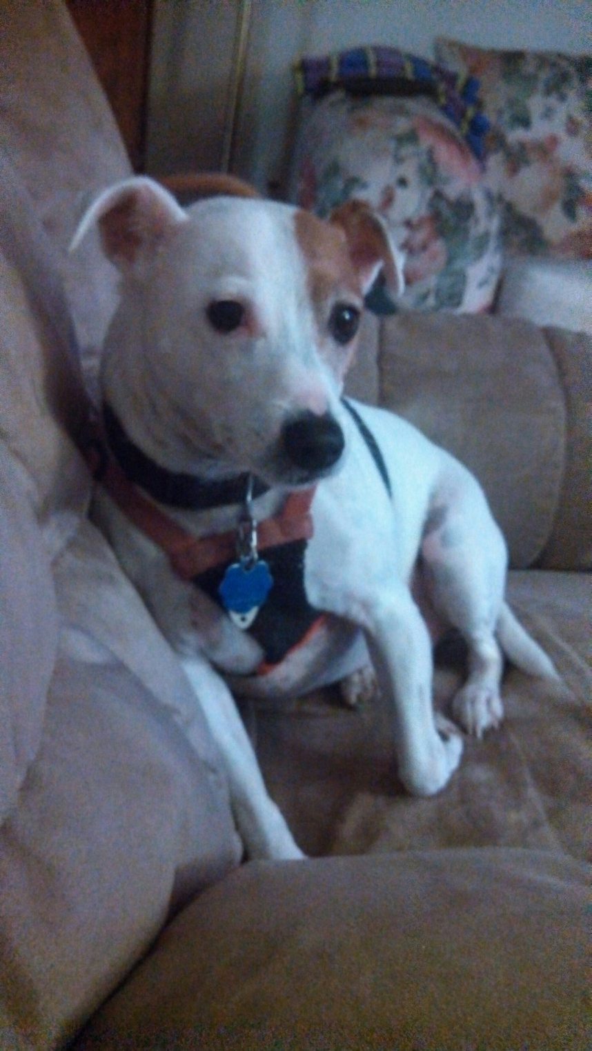 Painting of a Jack Russell Terrier wearing a red collar and tag, lying on a floral couch.