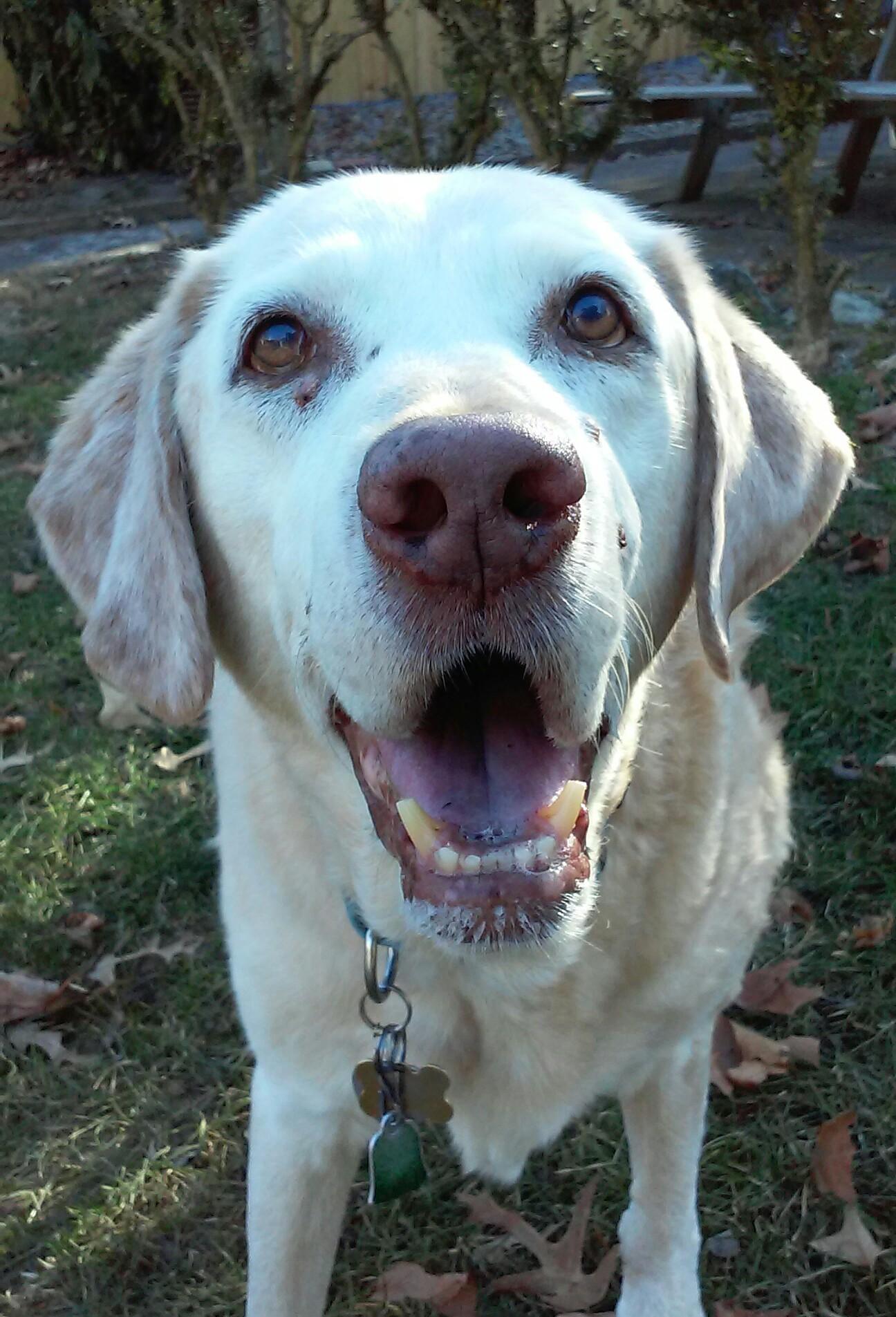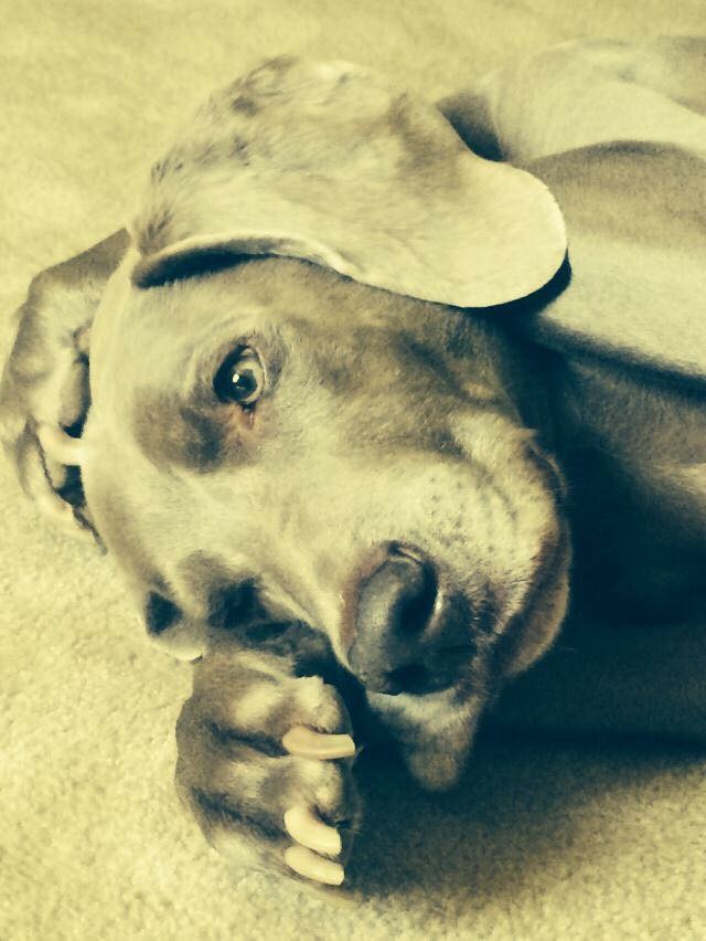 Painting of a gray Weimaraner puppy resting its head on its paws.