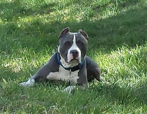 Painting of a pit bull puppy wearing a collar and tags, sitting in the grass