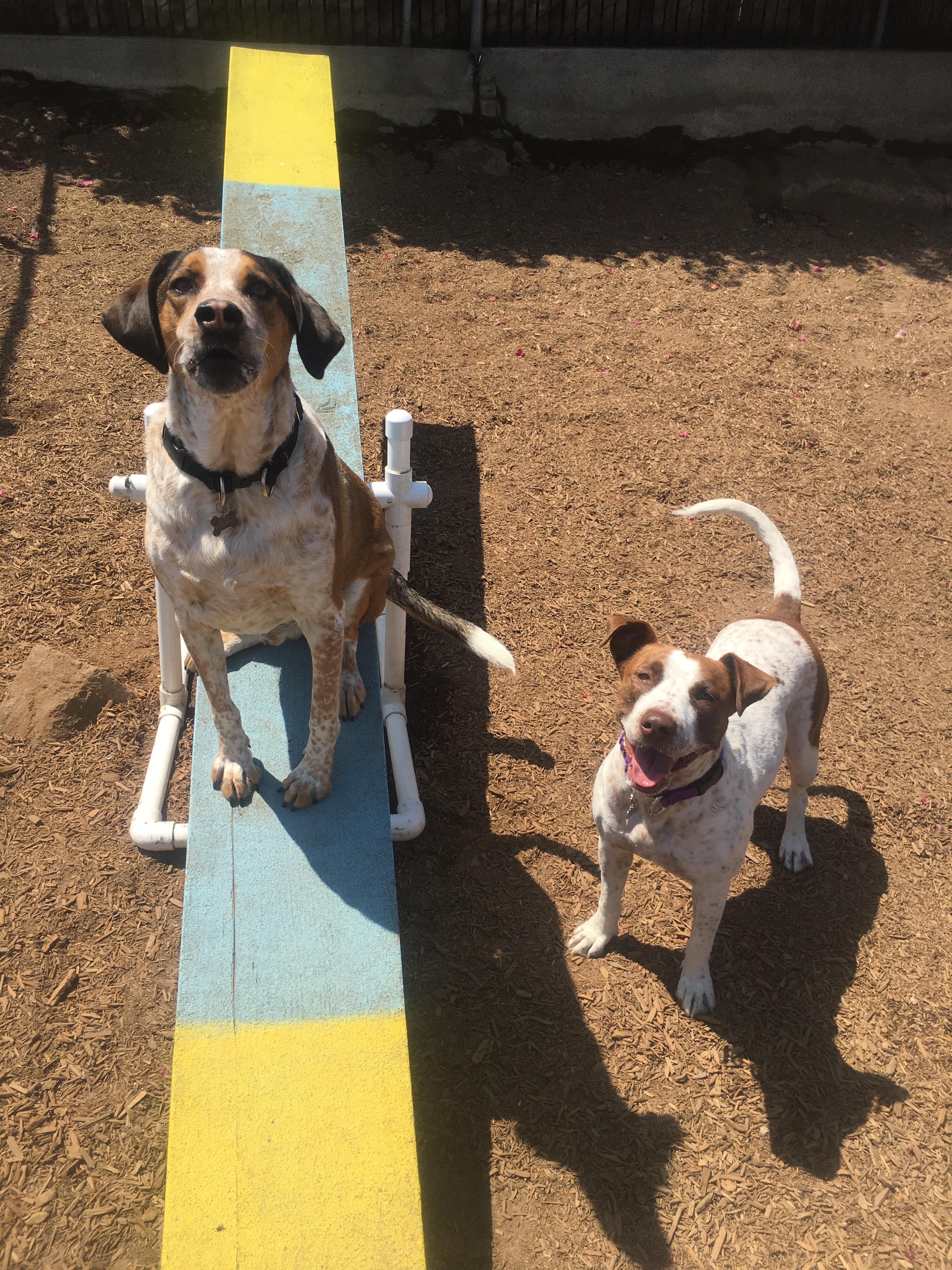Painting of two dogs, one sits on a teal and yellow seesaw, the other stands on the ground.