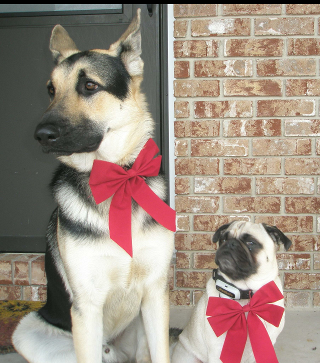 Painting of a German Shepherd and Pug wearing red bows.