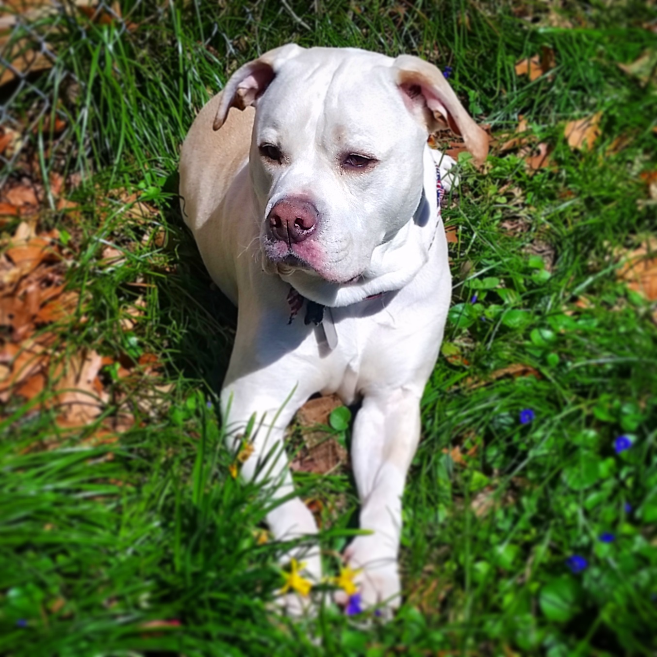 Painting of a white American Bulldog lying in the grass