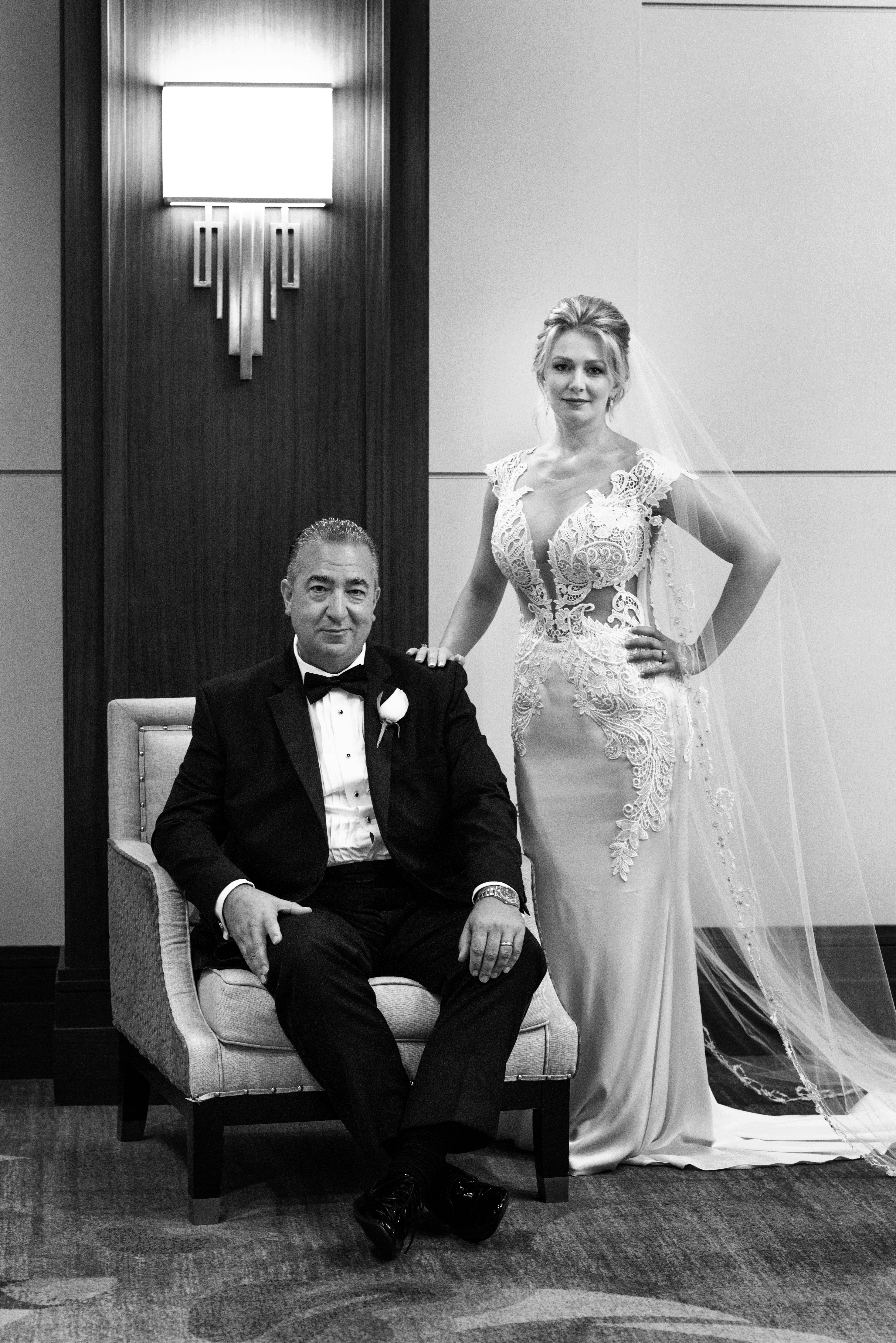 Black and white portrait painting of a bride and her father.