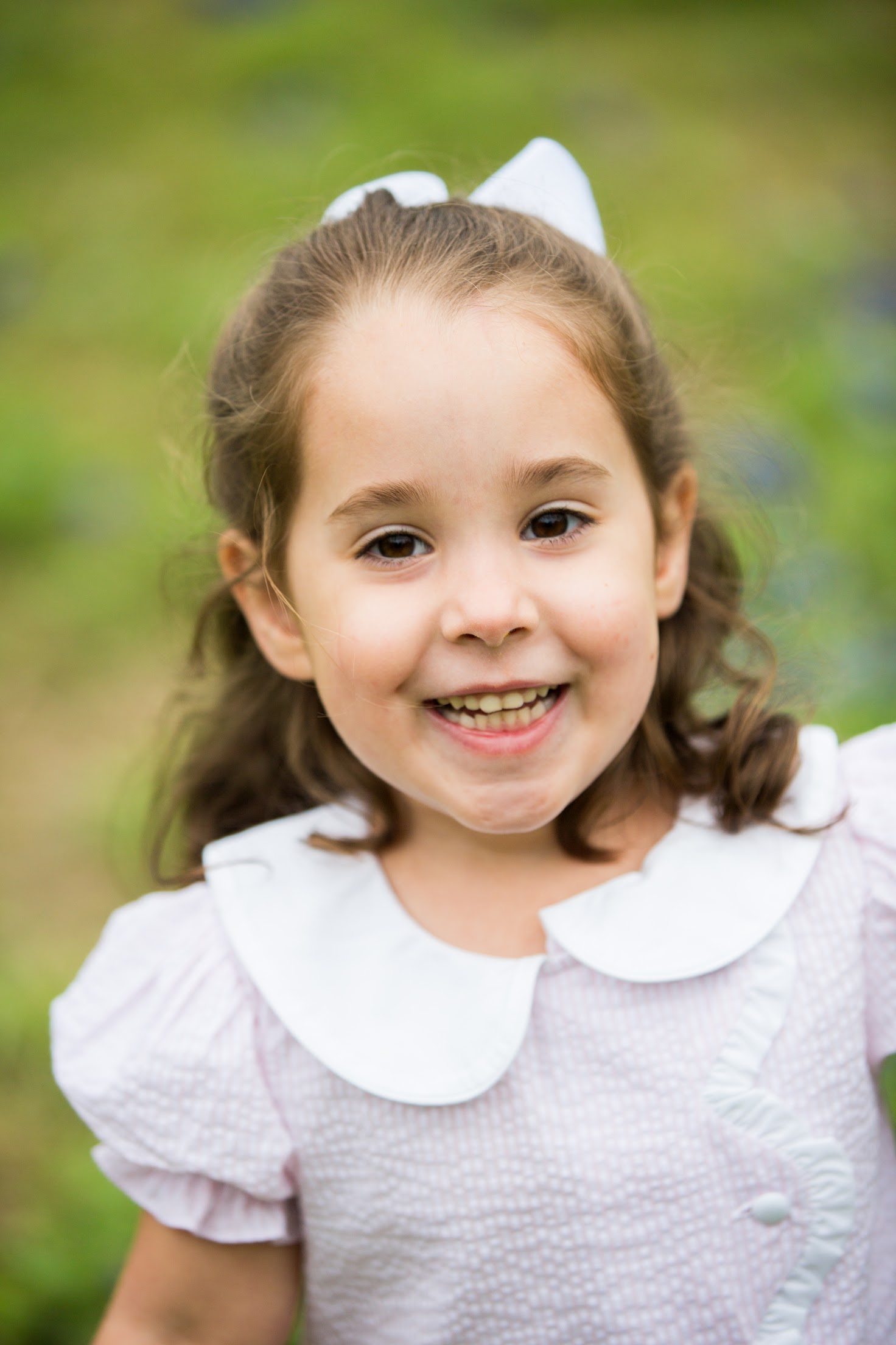 Portrait of a smiling girl with brown hair and a white bow in her hair, wearing a light purple dress.