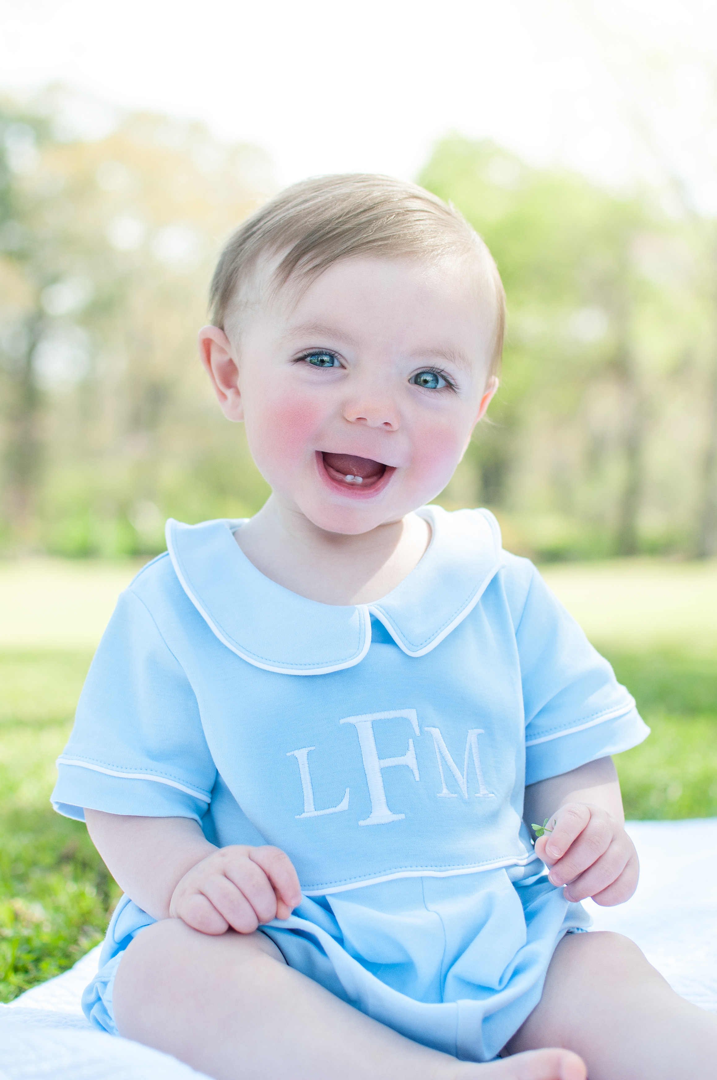 Portrait painting of a smiling toddler in a light blue outfit with monogramed initials.