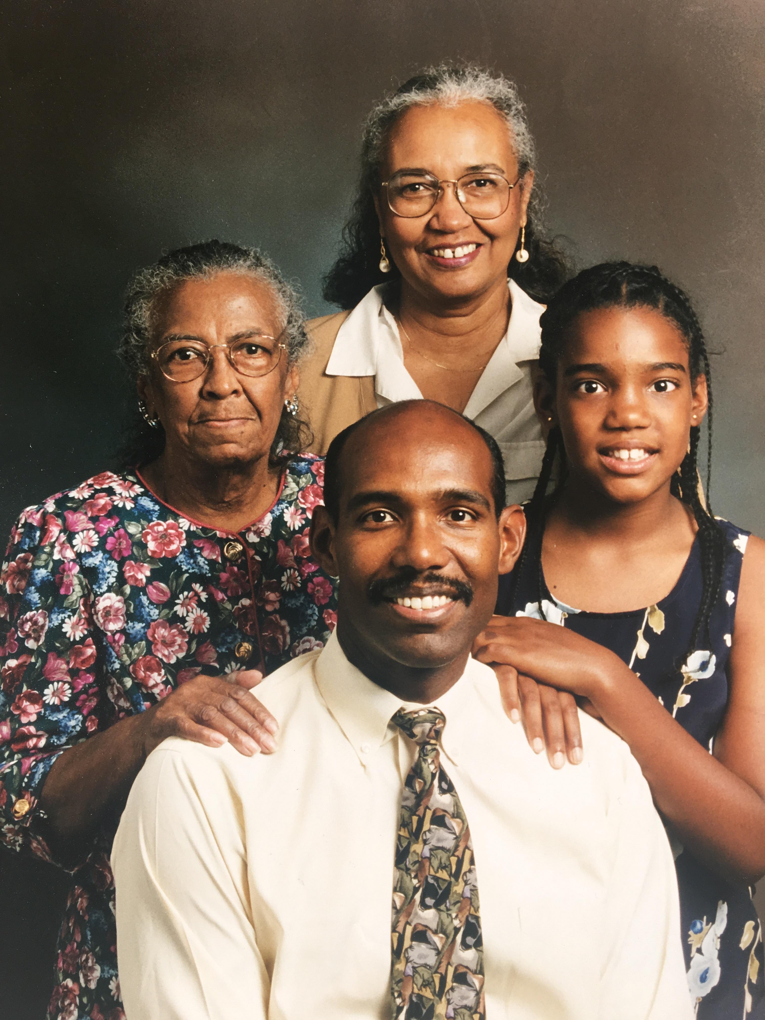 Painted portrait of a multigenerational Black family: a man, woman, older woman, and young girl.