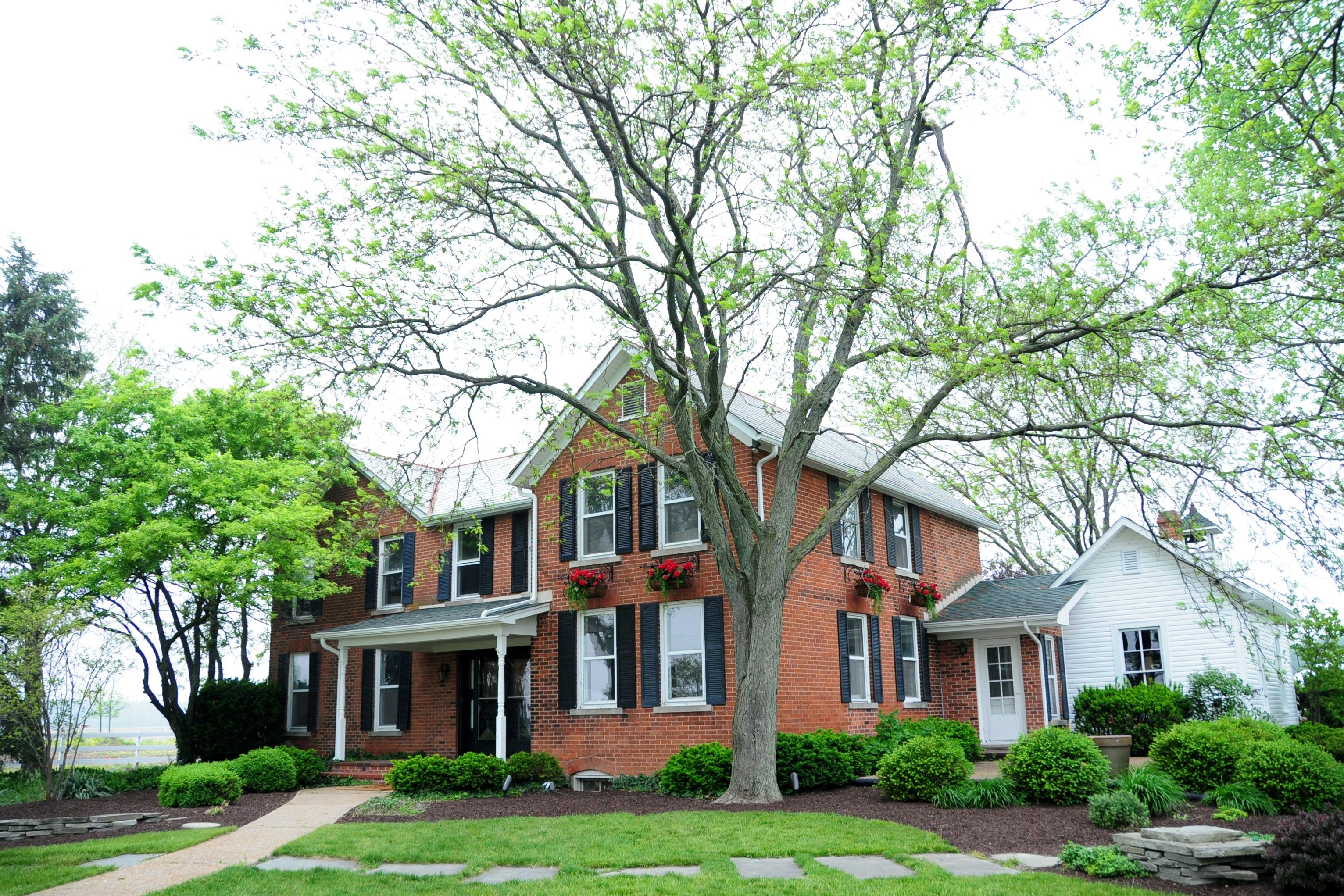 Painting of a brick house with black shutters and a white outbuilding, surrounded by lush green landscaping and trees.