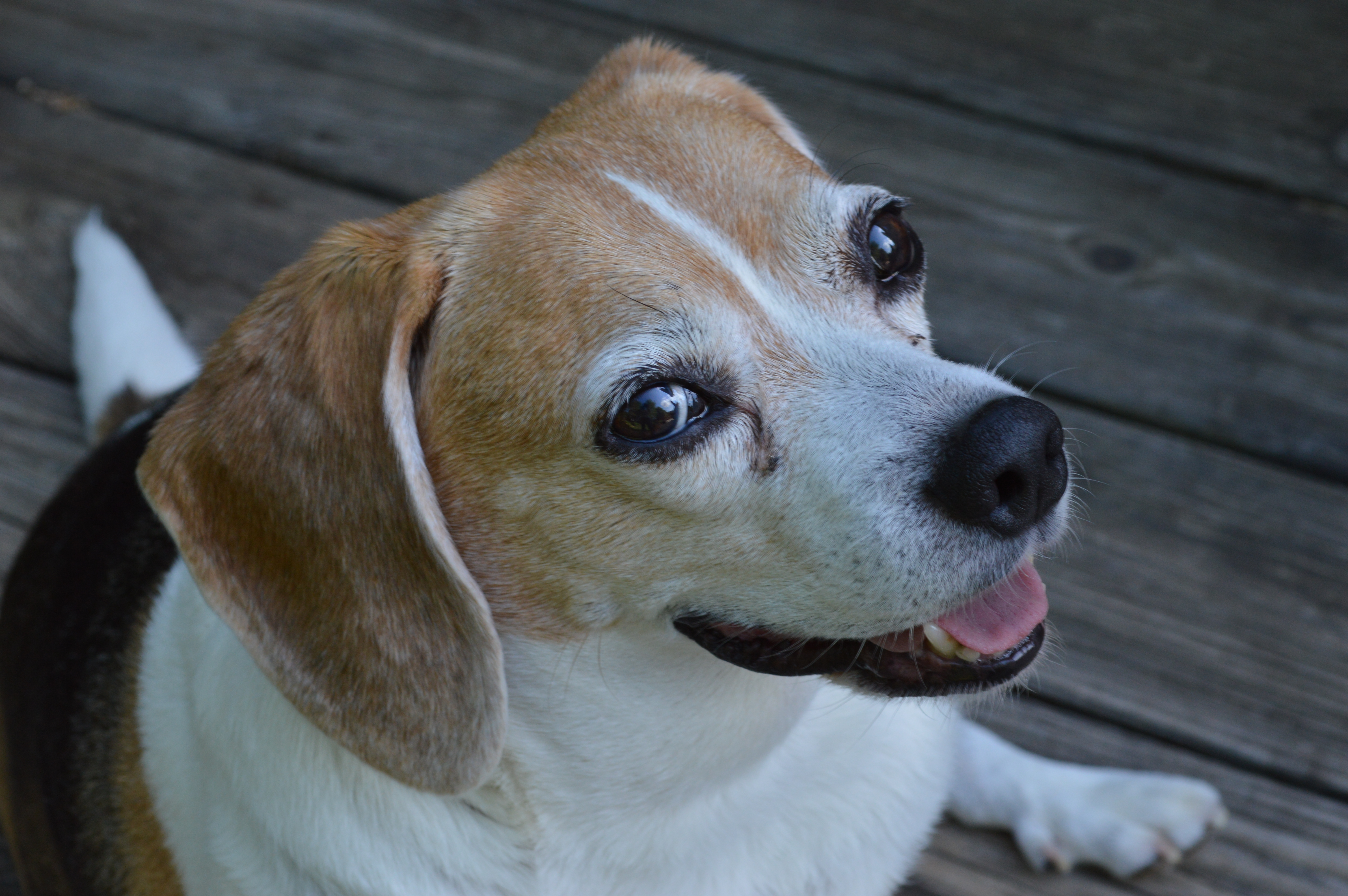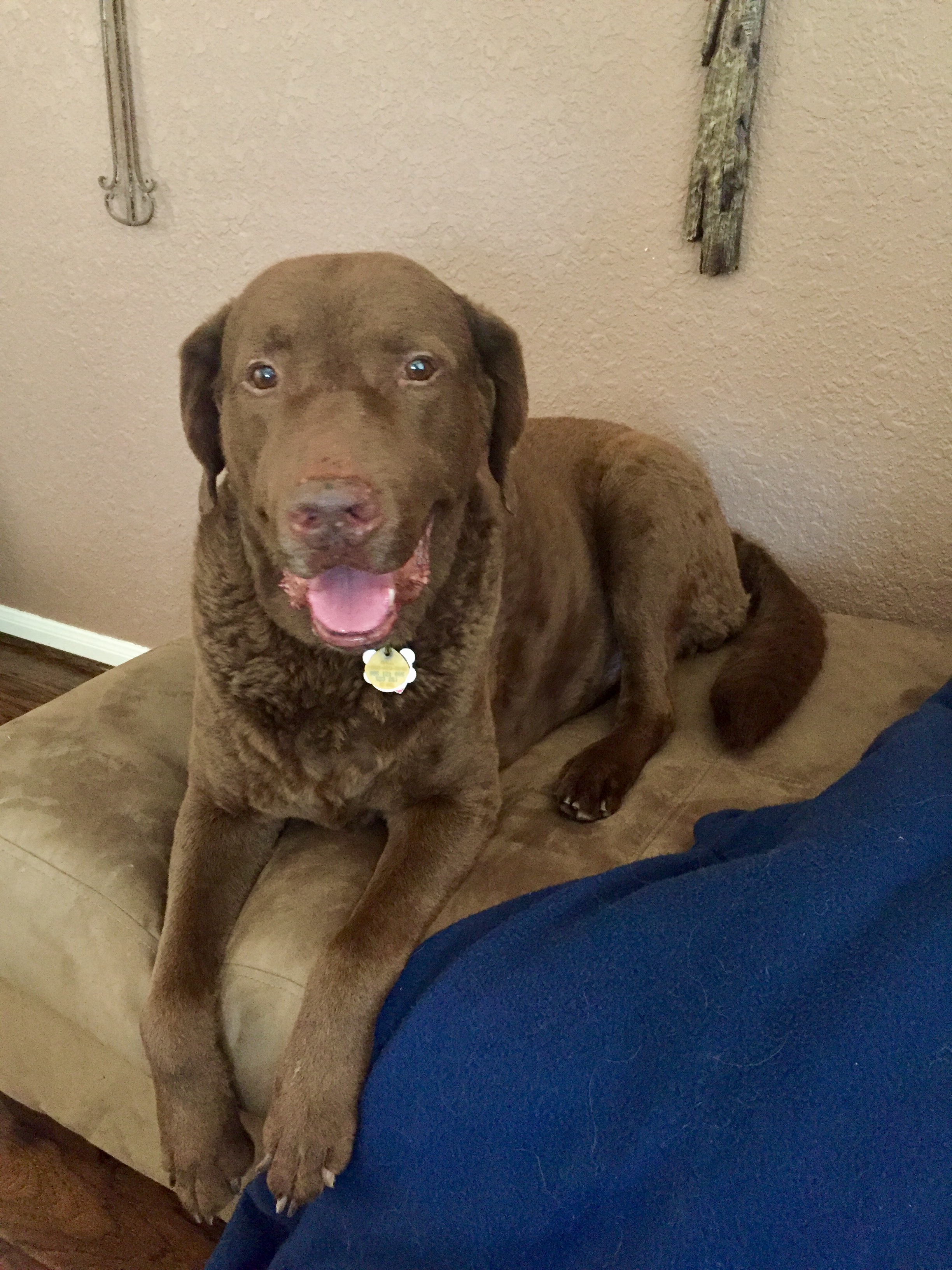 Painting of a chocolate Labrador Retriever lying on a blue blanket.
