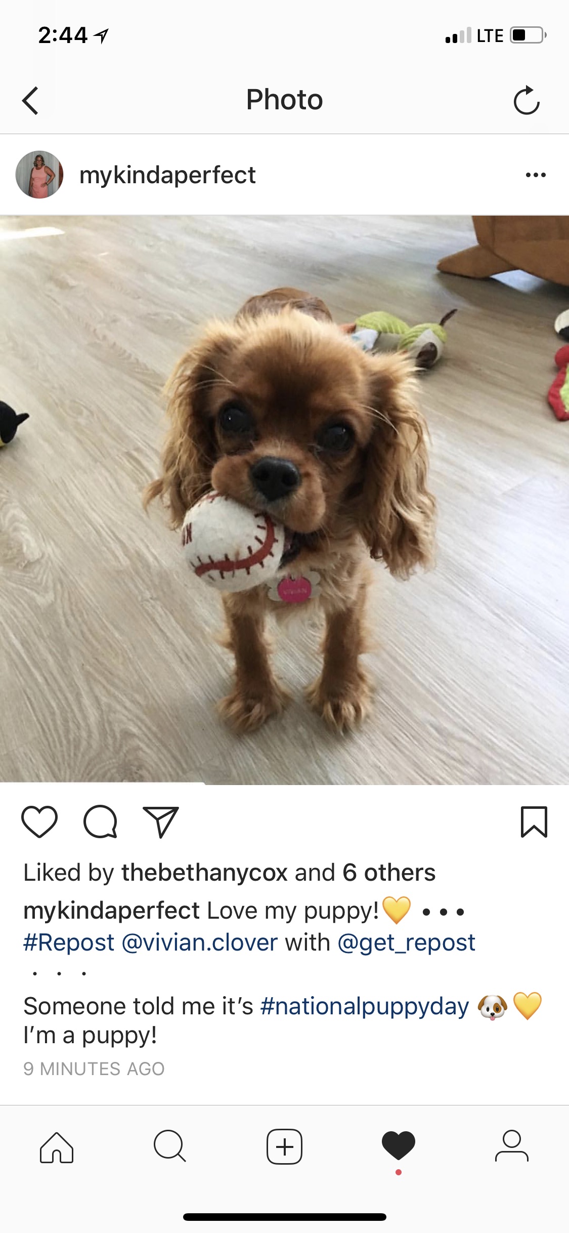 Painting of a Cavalier King Charles Spaniel puppy holding a baseball in a field of flowers.