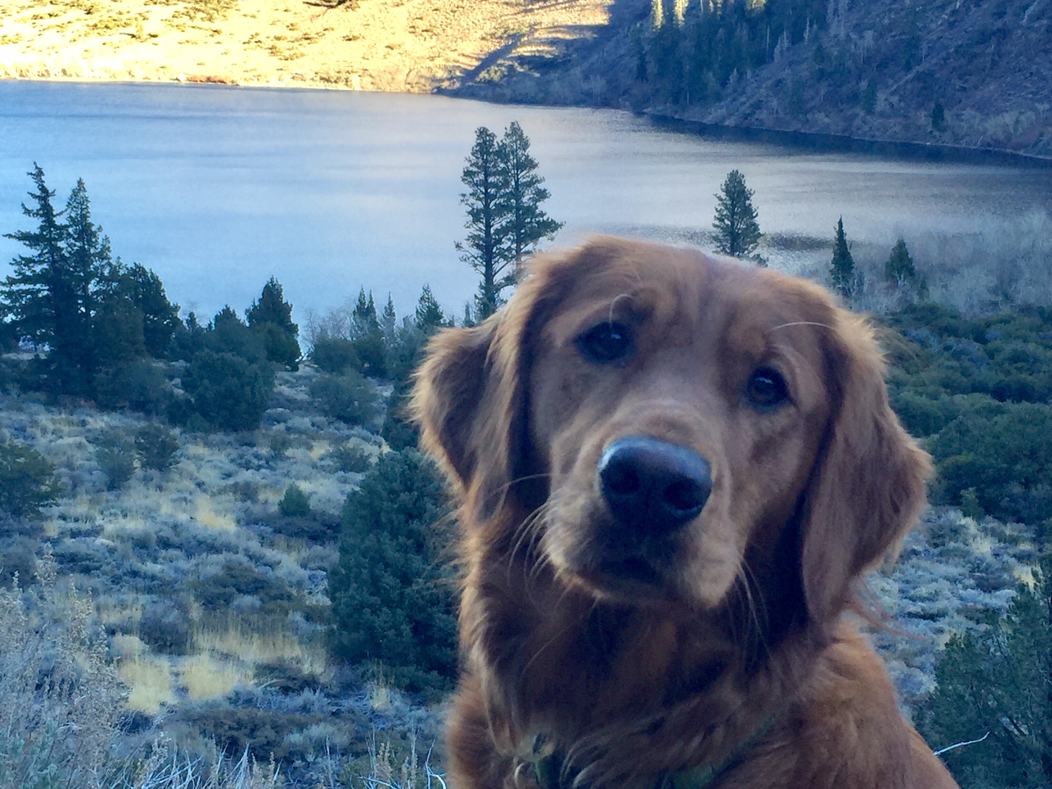 Painting of a golden retriever overlooking a lake and forest.