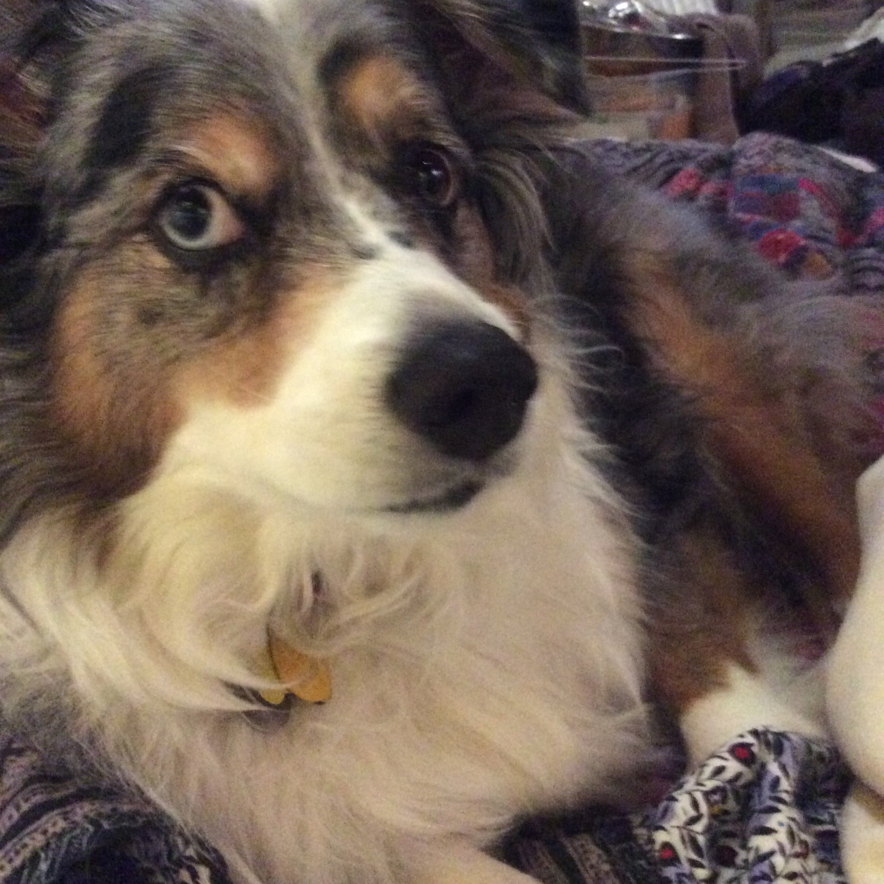 Painting of a brown and white dog with one blue eye, sitting on a patterned cushion.