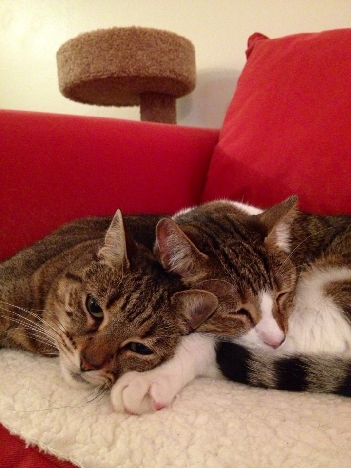 Two tabby cats cuddling on a cloud-like surface in a red chair.
