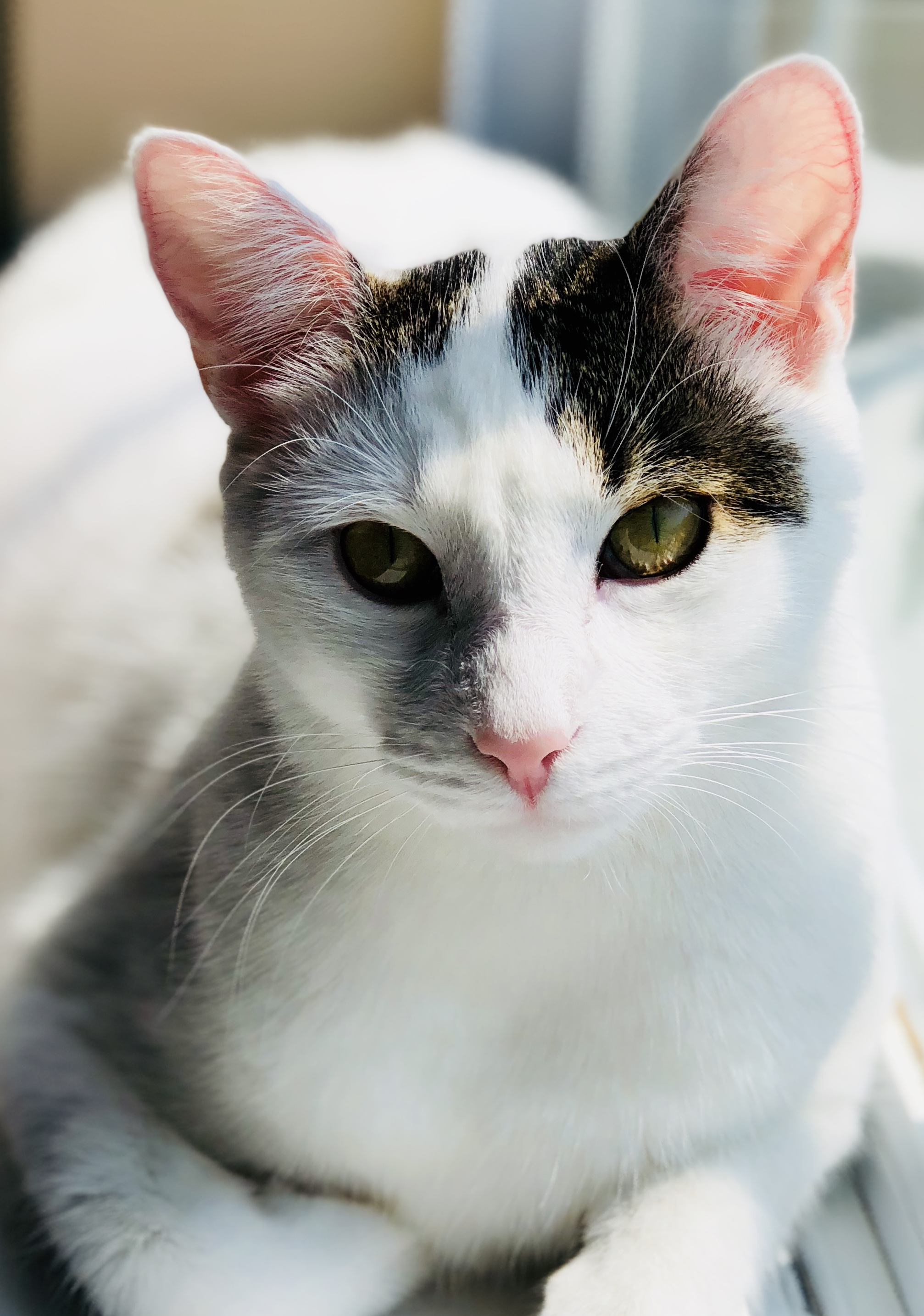 Painting of a calico cat with green eyes